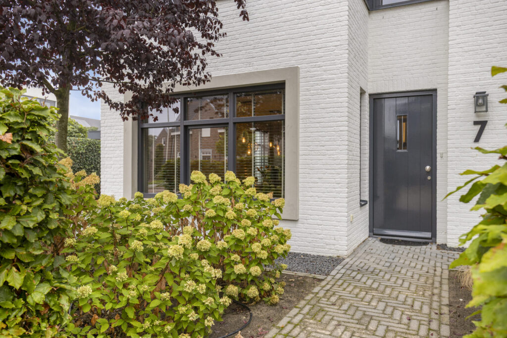 Aan de linkerzijde van de woning ligt de oprit met plaats voor twee auto’s. Via het looppad door de voortuin bereik je de entree van de woning.