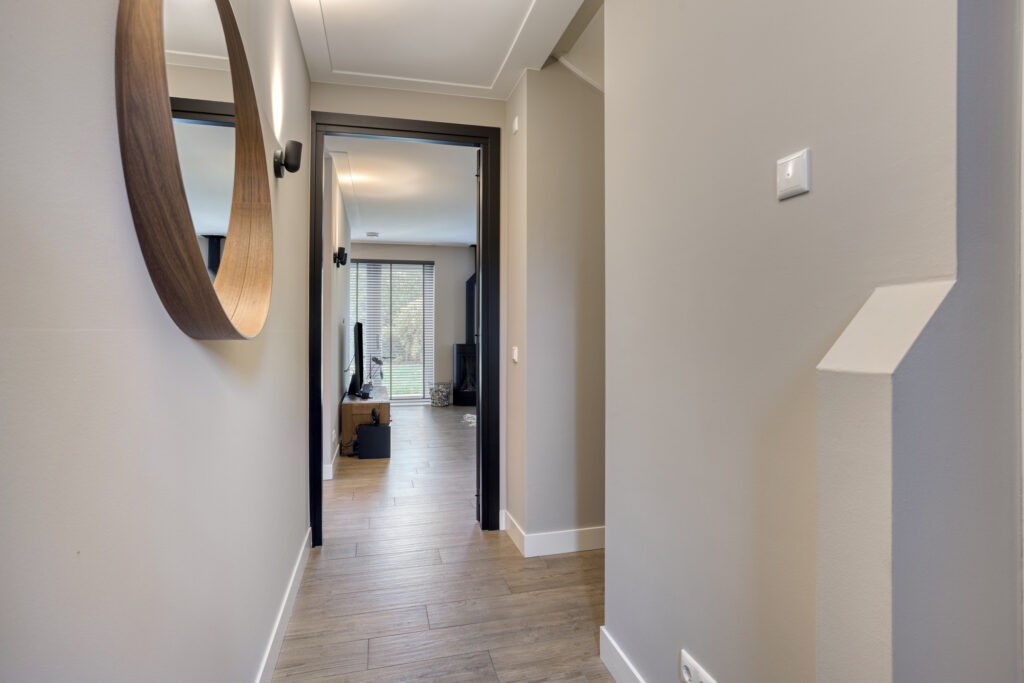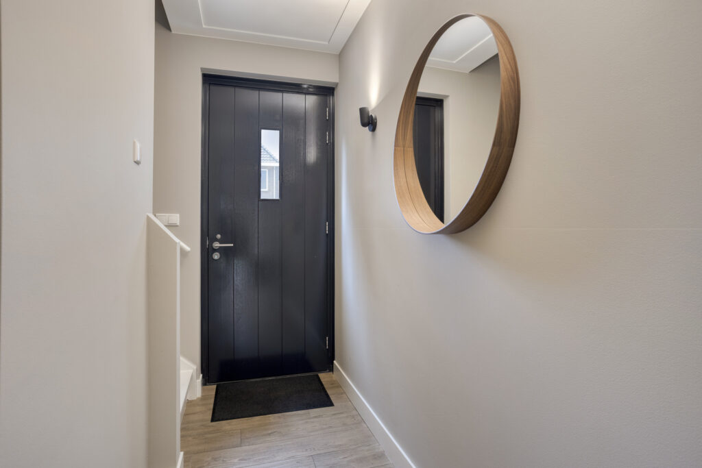 De hal maakt direct een verzorgde indruk: ruim, licht en afgewerkt met een stijlvolle houtlook tegelvloer die naadloos doorloopt naar de woonkamer. Hier bevinden zich de garderobe, meterkast en de trapopgang naar de eerste verdieping.