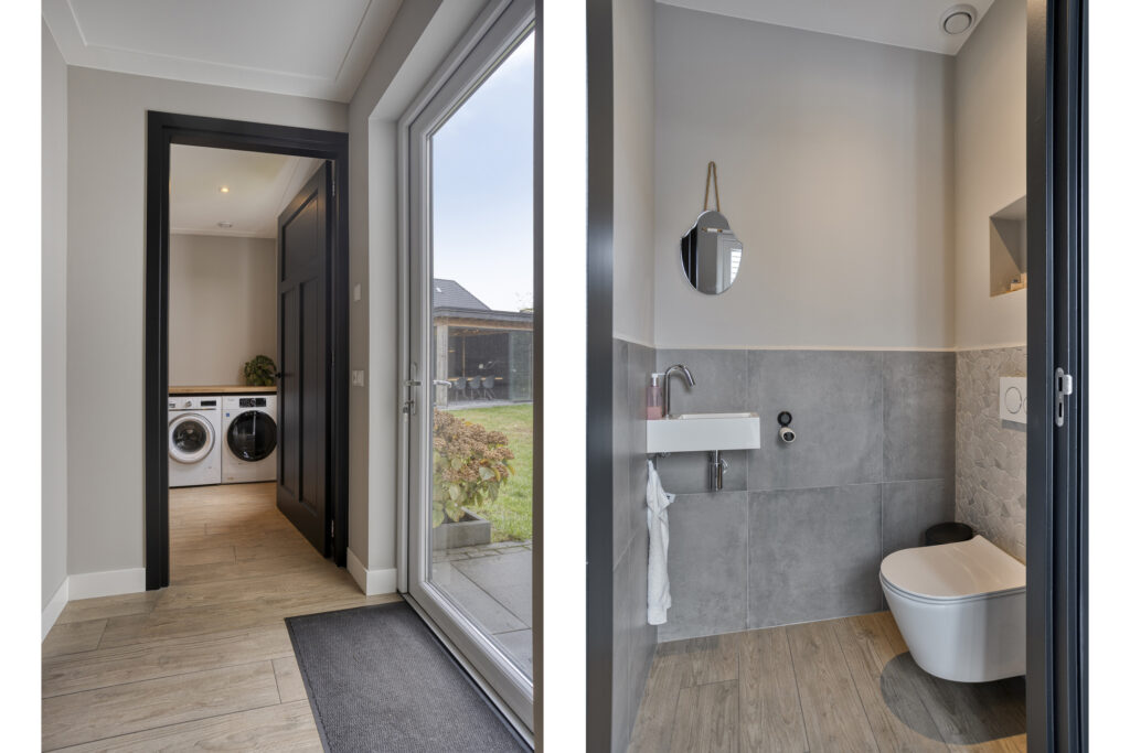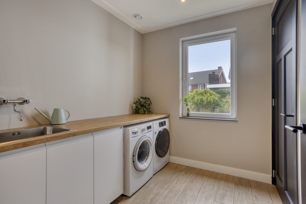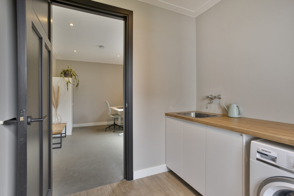 Vanuit het portaal is de praktische bijkeuken bereikbaar. Ingericht met een werkblad met onderkasten en een spoelbak. Hier bevinden zich de aansluitingen voor de wasapparatuur.