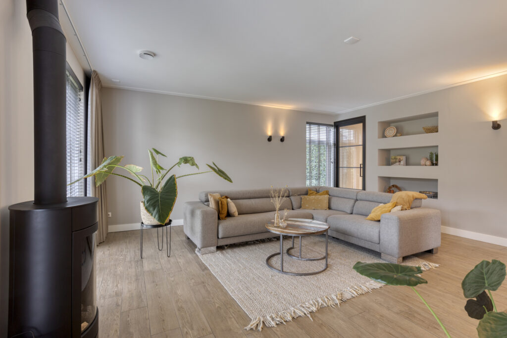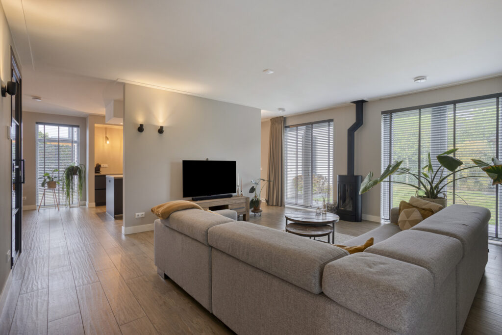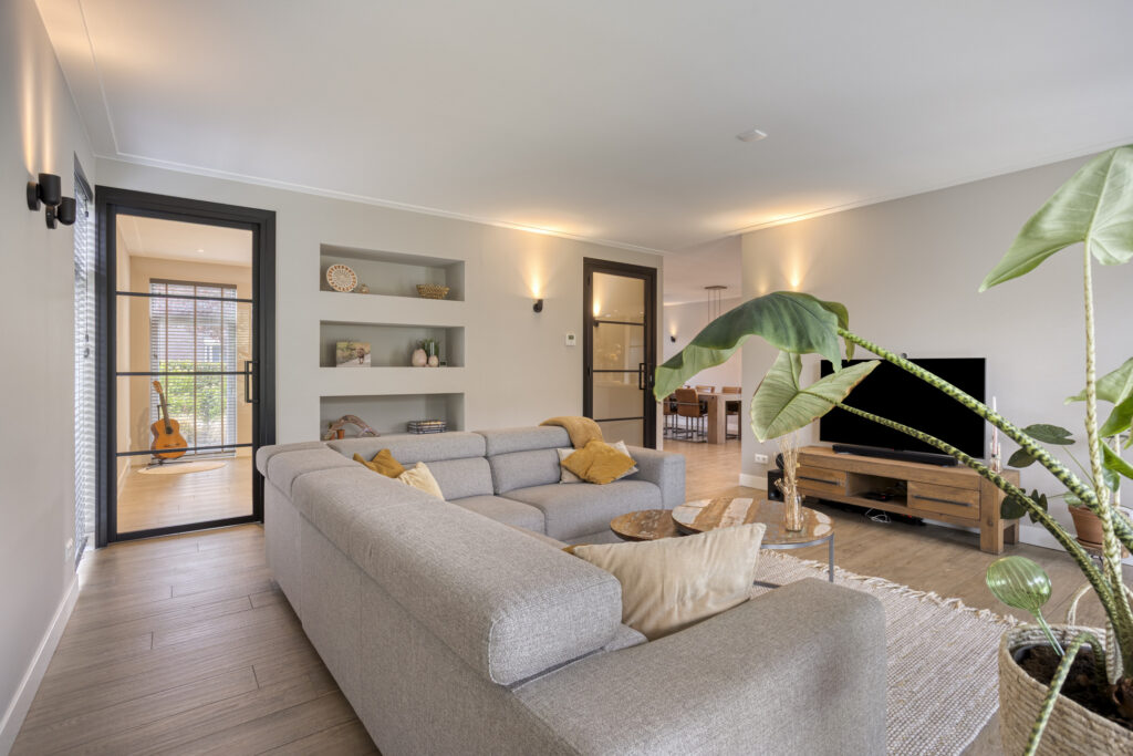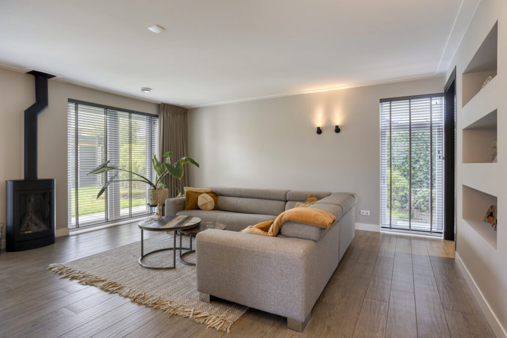 De woonkamer is een uitnodigende leefruimte met veel licht, ruimte en sfeer. Dankzij de grote ramen aan zowel de voor- als achterzijde is het hier op elk moment van de dag heerlijk licht. Aan de tuinzijde zorgen de dubbele openslaande deuren voor een directe verbinding met de tuin, waardoor binnen en buiten naadloos in elkaar overlopen.