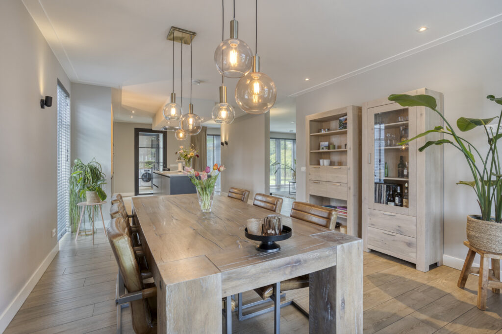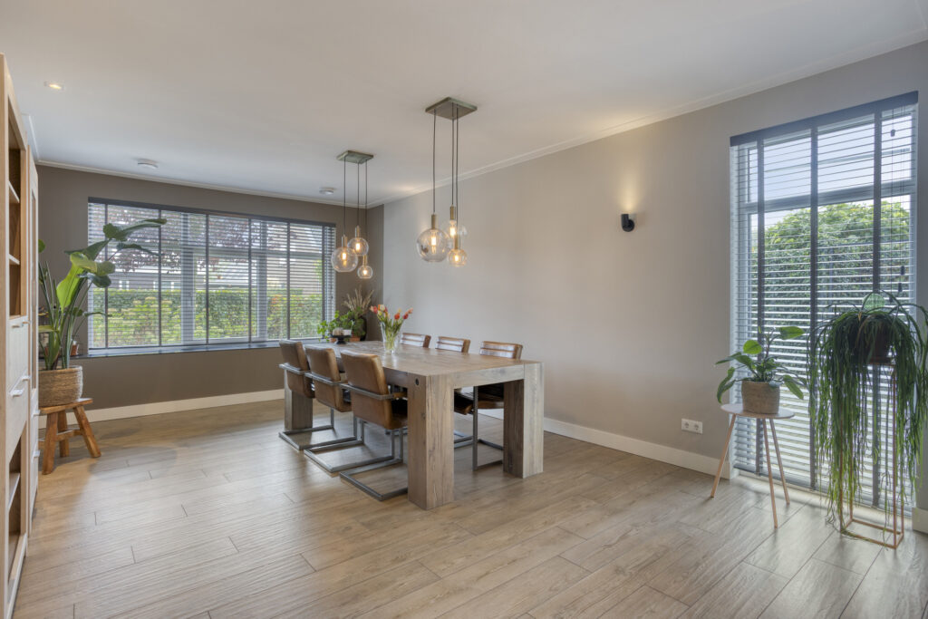 De ruimte is royaal opgezet met een duidelijke scheiding tussen het zit- en eetgedeelte, maar blijft toch één geheel dankzij de doorlopende vloer en rustige kleurstelling.