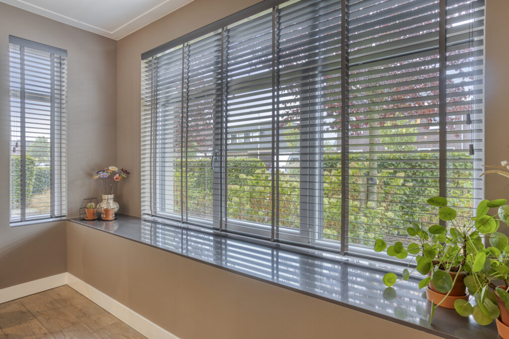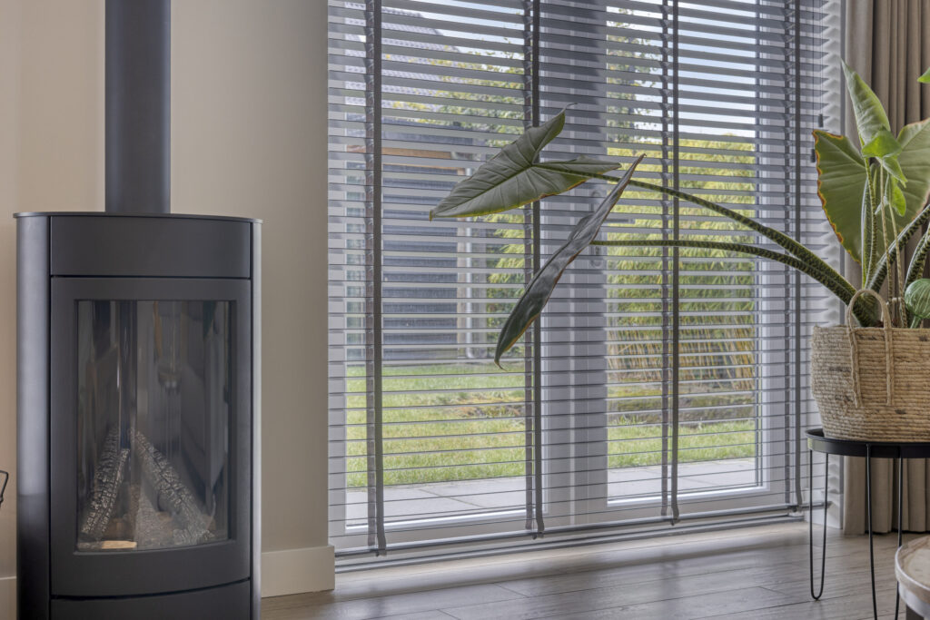 De verschillende ruimtes op de begane grond zijn met elkaar verbonden door glazen deuren met een strak zwart frame. Deze vormen een stijlvol geheel binnen het interieur en zorgen voor een open en lichte uitstraling. Alle wanden zijn voorzien van strak stucwerk. Ook de plafonds zijn strak gestuct en afgewerkt met een platte sierlijst.