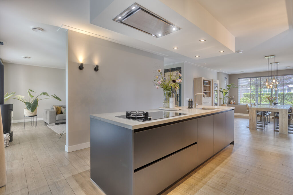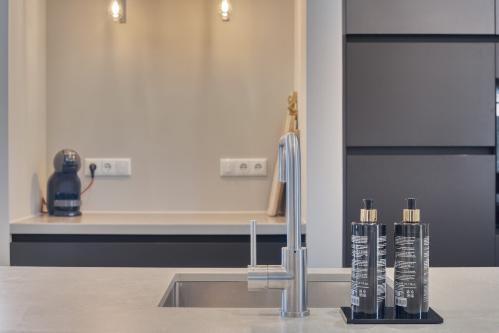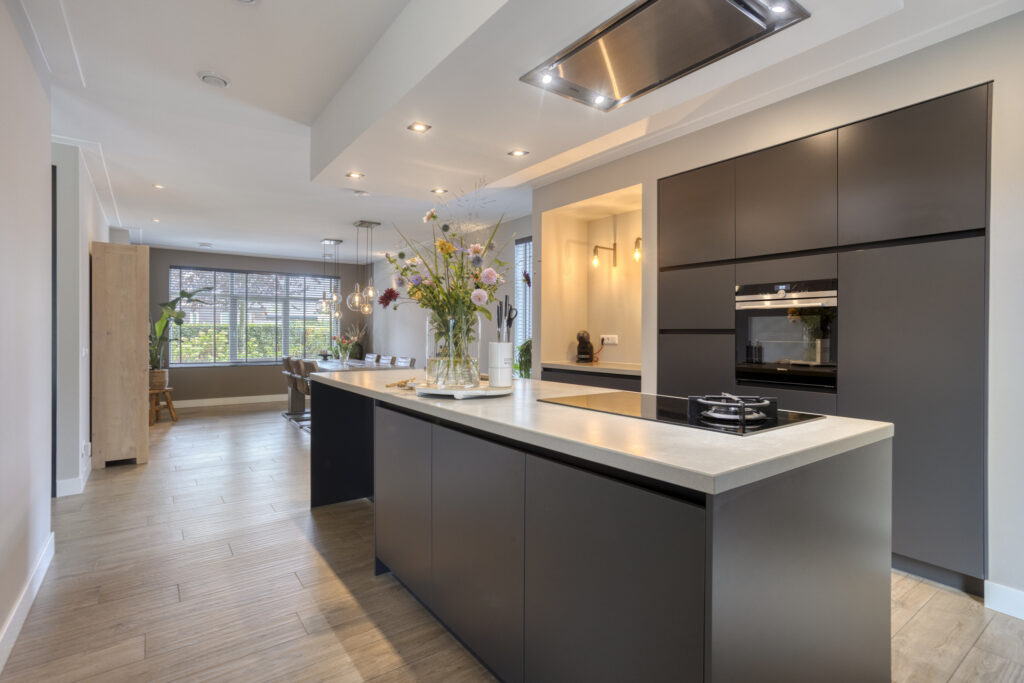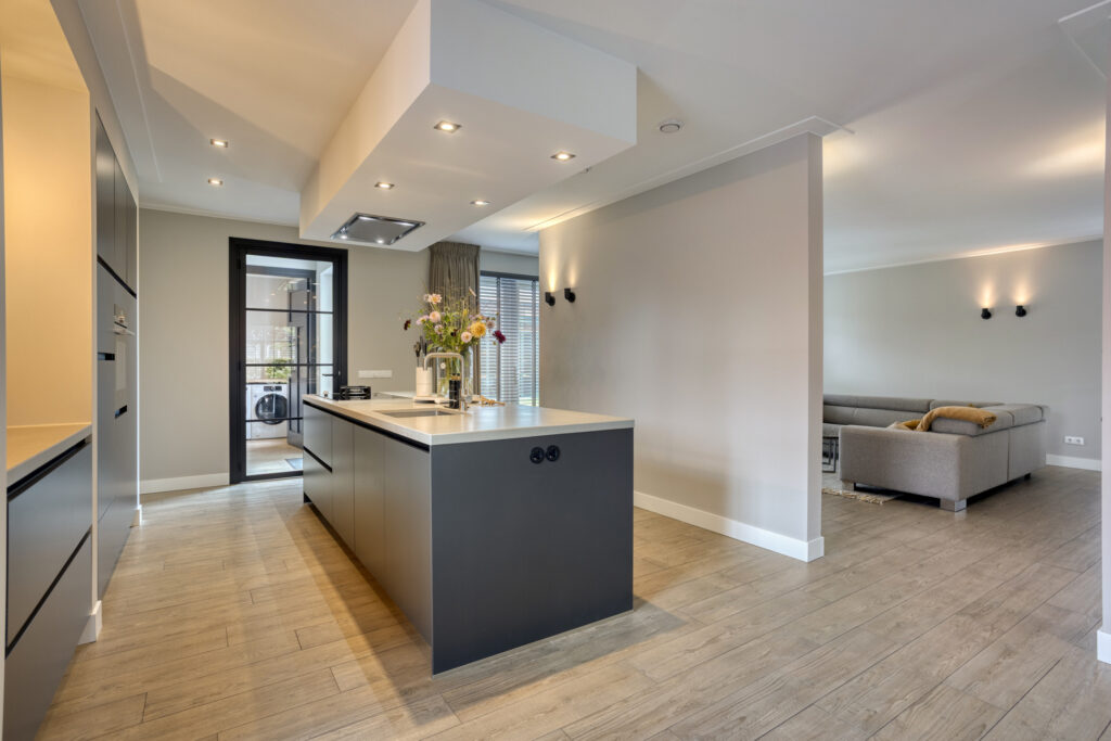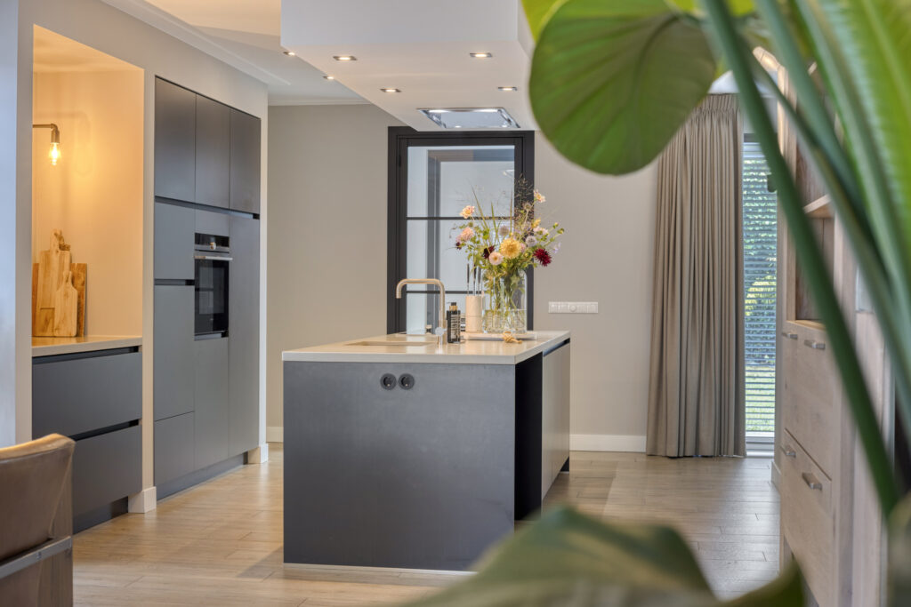 De open keuken sluit perfect aan op de woonkamer en vormt het hart van het huis. De opstelling is modern en strak. De keukeninrichting bestaat uit een kookeiland, kastenwand en aparte koffiehoek. De zwarte fronten staan in mooi contrast met het composieten blad in een lichte tint. Alle apparatuur is netjes geïntegreerd, waaronder een inductiekookplaat, afzuigkap, combi-oven, koelkast en vaatwasser (op hoogte). De close-in boiler zorgt voor het warme water in de keuken.