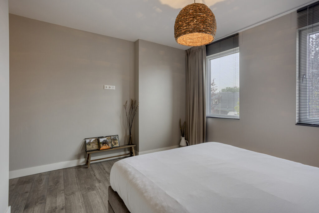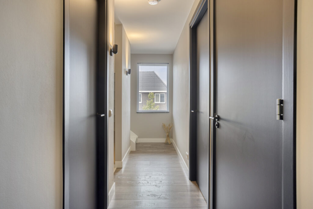 De overloop en slaapkamers zijn voorzien van een laminaatvloer. Alle wanden en plafonds zijn strak gestuukt. Dit geeft ook deze verdieping een rustige uitstraling.