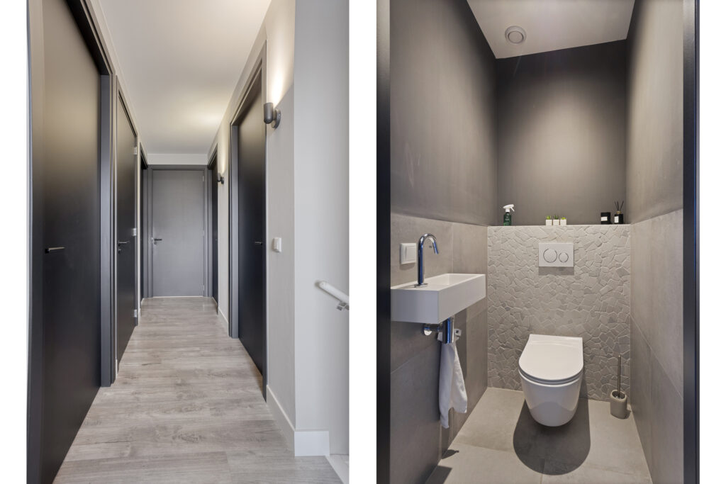 De toiletruimte is afgewerkt in dezelfde stijl als de badkamer. De tegelvloer loopt door vanuit het portaal. De wanden zijn deels betegeld en zijn daarboven strak gestuukt. De ruimte is voorzien van een hangtoilet en fonteintje. De nis in de achterwand geeft de ruimte een speels effect.