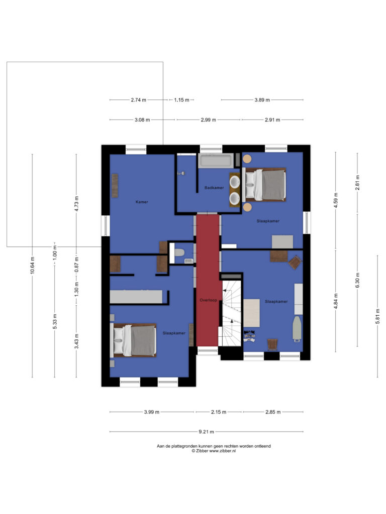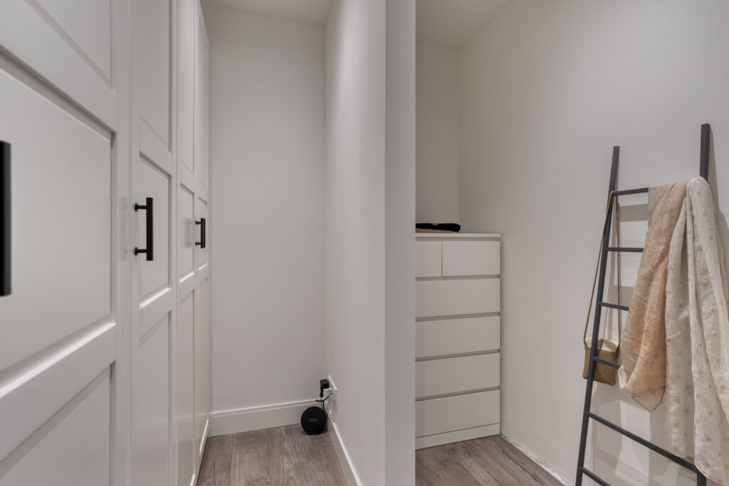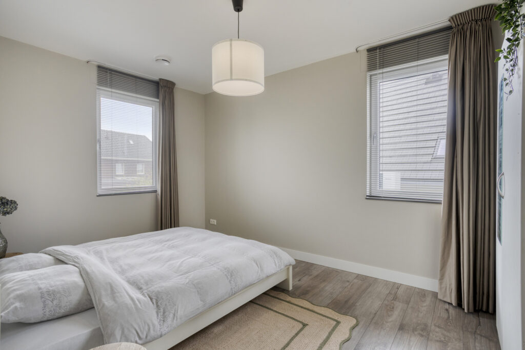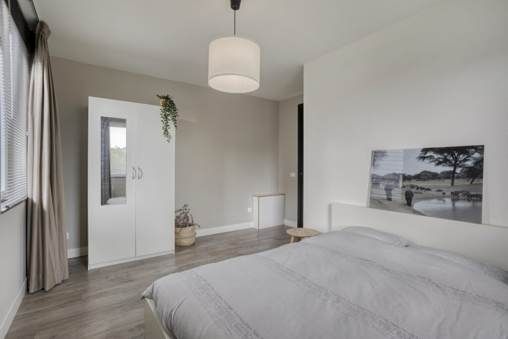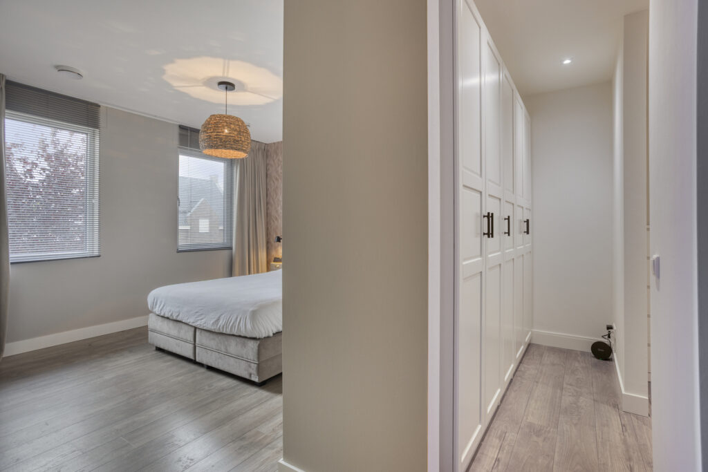 De hoofdslaapkamer ligt aan de voorzijde van de woning en is een comfortabele en sfeervolle ruimte met aangrenzende inloopkast. De kamer biedt voldoende ruimte voor een groot bed en beschikt over twee grote ramen voor een prettige lichtinval. De inloopkast is een luxe toevoeging. In de aangrenzende ruimte zijn al voorbereidingen getroffen voor het realiseren van een tweede badkamer met douche en toilet.
