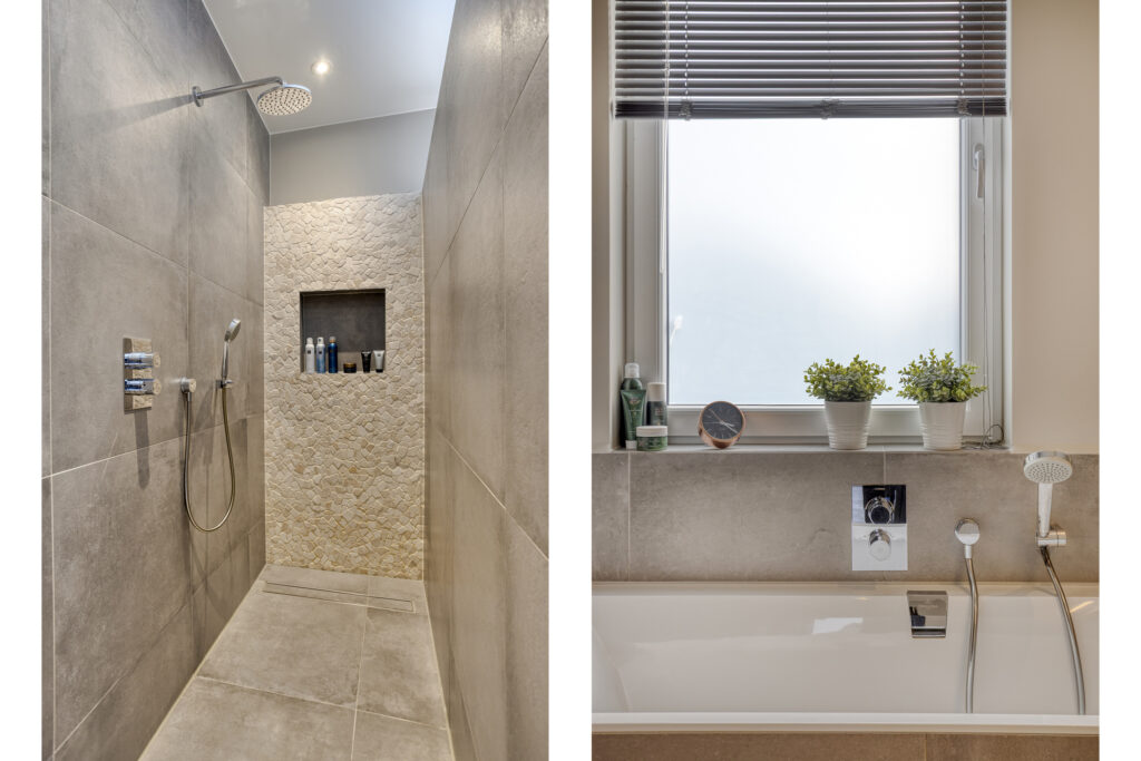 Strakke inbouwkranen, een moderne tegelvloer met vloerverwarming, plafondspots en een raam dat geopend kan worden voor natuurlijke ventilatie maken het geheel niet alleen stijlvol, maar ook praktisch en comfortabel in gebruik.