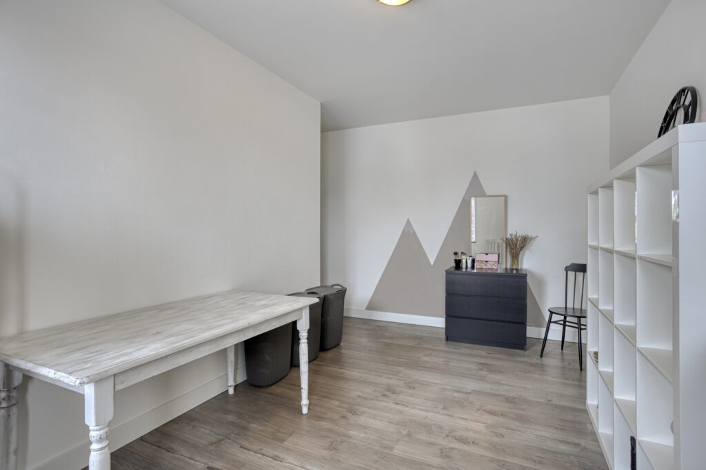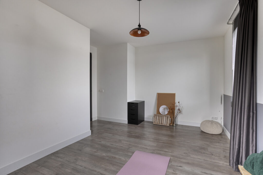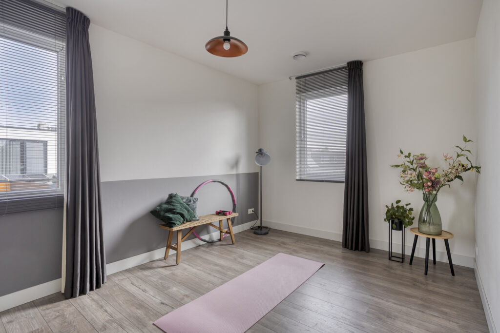 Ook hier zorgen de grote ramen voor veel daglicht en een aangename sfeer. Deze ruimte is nu in gebruik als sportkamer maar qua ruimte meer dan ruim genoeg voor kinderkamer of logeerkamer.
