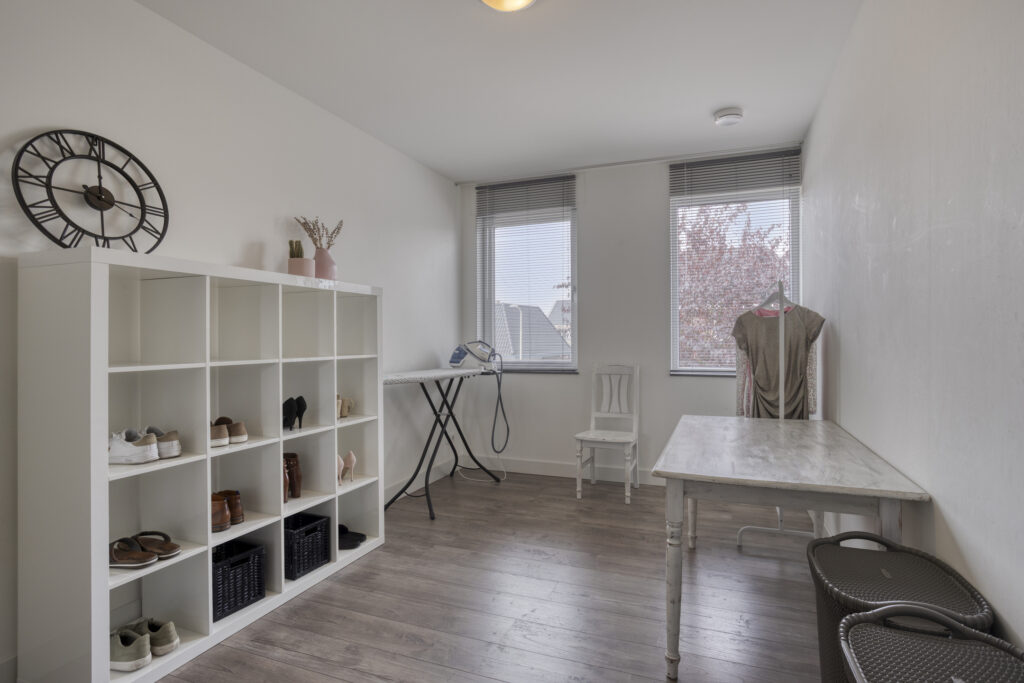 Vanuit de zithoek is de extra kamer op de begane grond, aan de voorzijde van de woning, bereikbaar. De kamer is licht en netjes afgewerkt en kijkt uit over de rustige straatzijde.