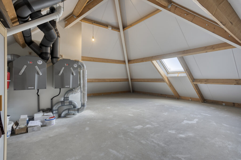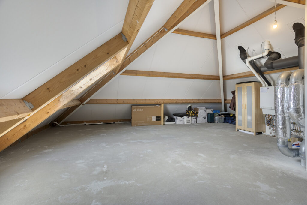 De zolderverdieping is ruim en nog volledig naar wens in te delen — met gemak creëer je hier twee extra slaapkamers en blijft er dan nog voldoende bergruimte over.