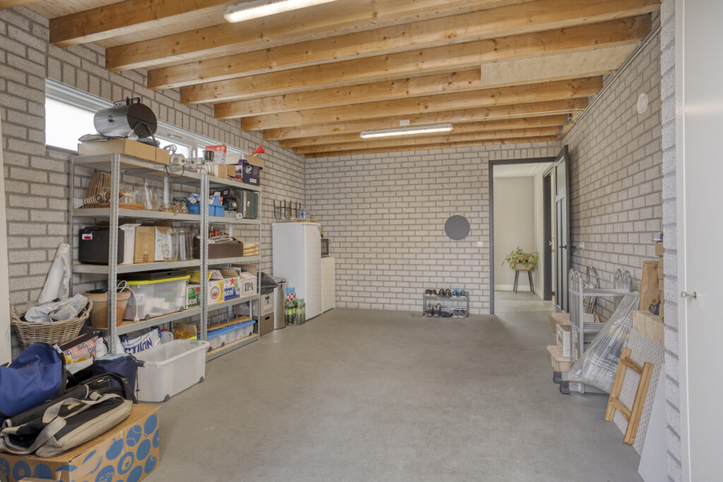 Aangrenzend bevindt zich de ruime garage met dubbele houten deuren naar de oprit. Een nette, goed onderhouden ruimte, voorzien van elektra, met voldoende plek voor auto, fietsen of hobbyspullen.