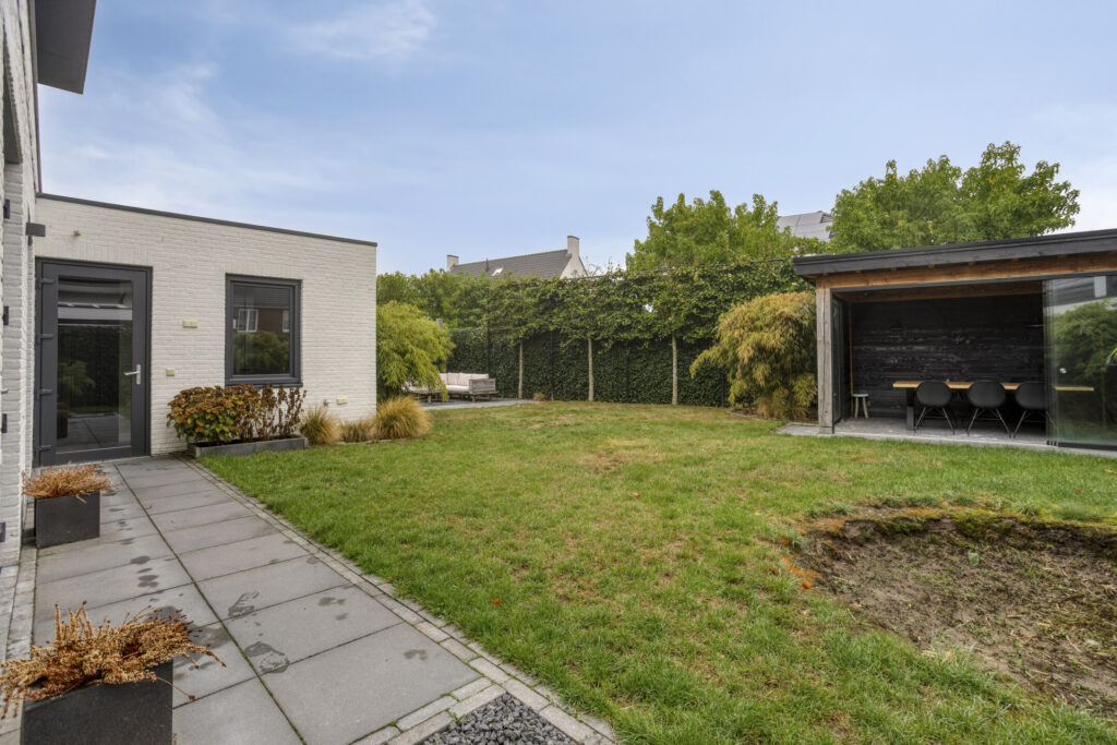Blikvanger in de tuin is de houten overkapping met glazen schuifwanden. Een heerlijke plek op zowel warme dagen als de wat frissere momenten. Aangrenzend bevindt zich nog een tuinberging, perfect voor het opbergen van tuinspullen.