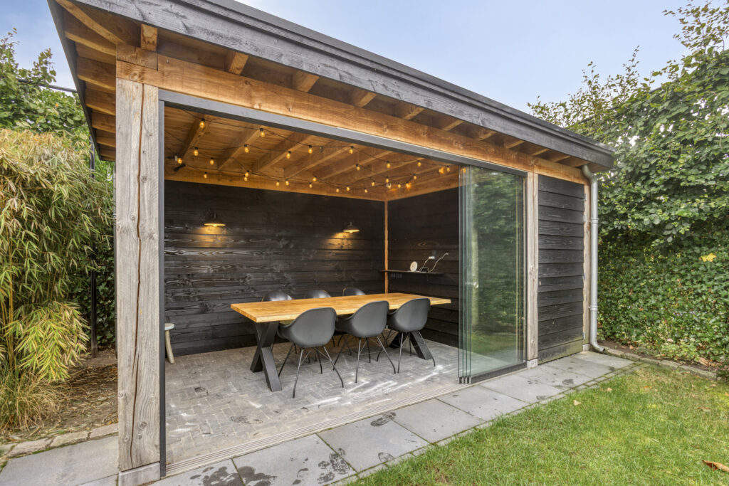 – Sfeervolle houten overkapping met glazen wanden in achtertuin;