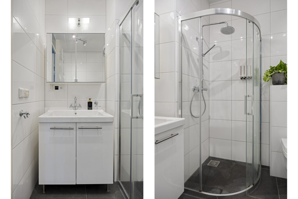 White wall tiles combined with grey floor tiles create a timeless and elegant atmosphere. Heating is provided by a designer radiator, and ventilation is managed via mechanical ventilation.