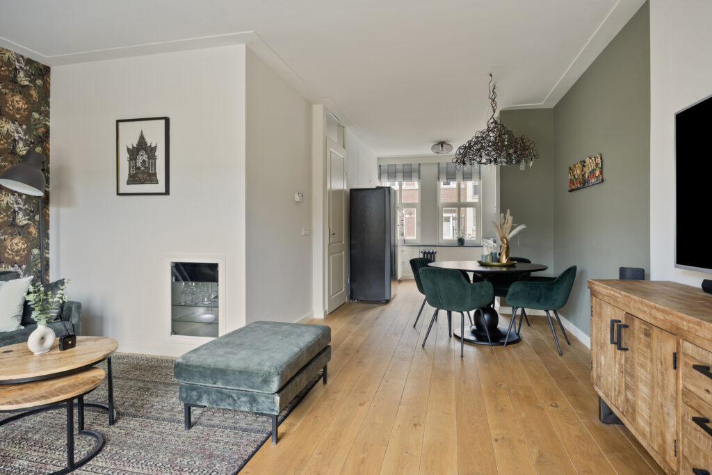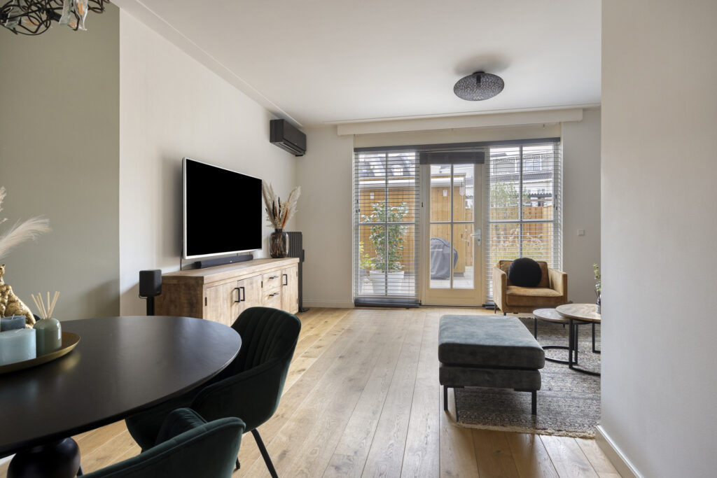 De woonkamer is een royale en uitnodigende leefruimte. Aan de achterzijde zorgen de grote raampartijen en tuindeur voor een overvloed aan natuurlijk licht en een directe verbinding met de tuin. De houten vloer en de strak gestucte wanden geven het geheel een luxe uitstraling. In de woonkamer is een gashaard en een airco aanwezig zodat er in alle maanden van het jaar heerlijk genoten kan worden van een perfect binnenklimaat.