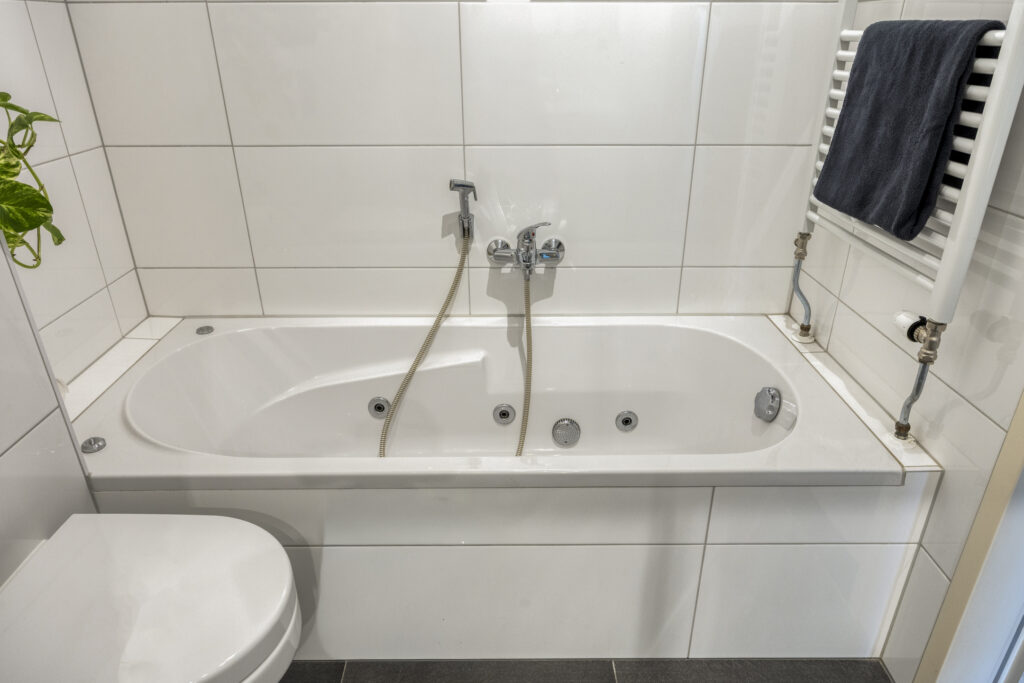 De moderne badkamer is compleet ingericht en luxe afgewerkt. Er is een ligbad voor de nodige ontspanning én een separate inloopdouche met glazen wand en moderne regendouche met thermostaatkraan. Naast het bad bevindt zich het hangend toilet. Het strakke wastafelmeubel met spiegelkast biedt opbergruimte en maakt het geheel af. De combinatie van witte wandtegels met grijze vloertegels zorgt voor een tijdloze en stijlvolle sfeer. De ruimte kan verwarmd worden met de aanwezige designradiator en ventilatie is mogelijk met de mechanische ventilatie.