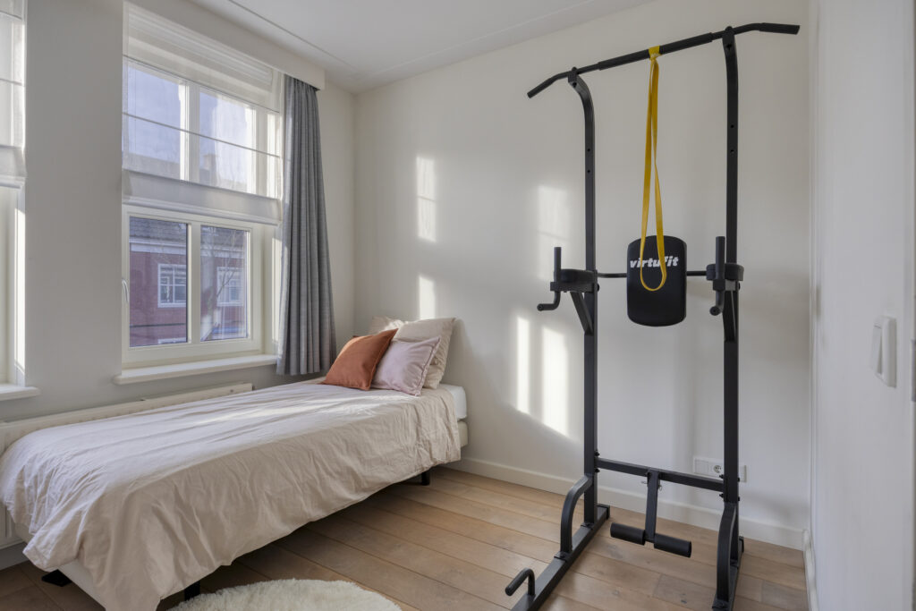 Deze derde kamer, eveneens aan de voorzijde gelegen, is nu in gebruik als kastenkamer. De oppervlakte is ca. 6m². Het grote draai-/kiepraam zorgt voor een fijne lichtinval, waardoor dit een ideale plek is om rustig te werken of te studeren of om als kastenkamer te gebruiken. Uiteraard kan de kamer ook gebruikt worden als extra slaap- of logeerkamer.