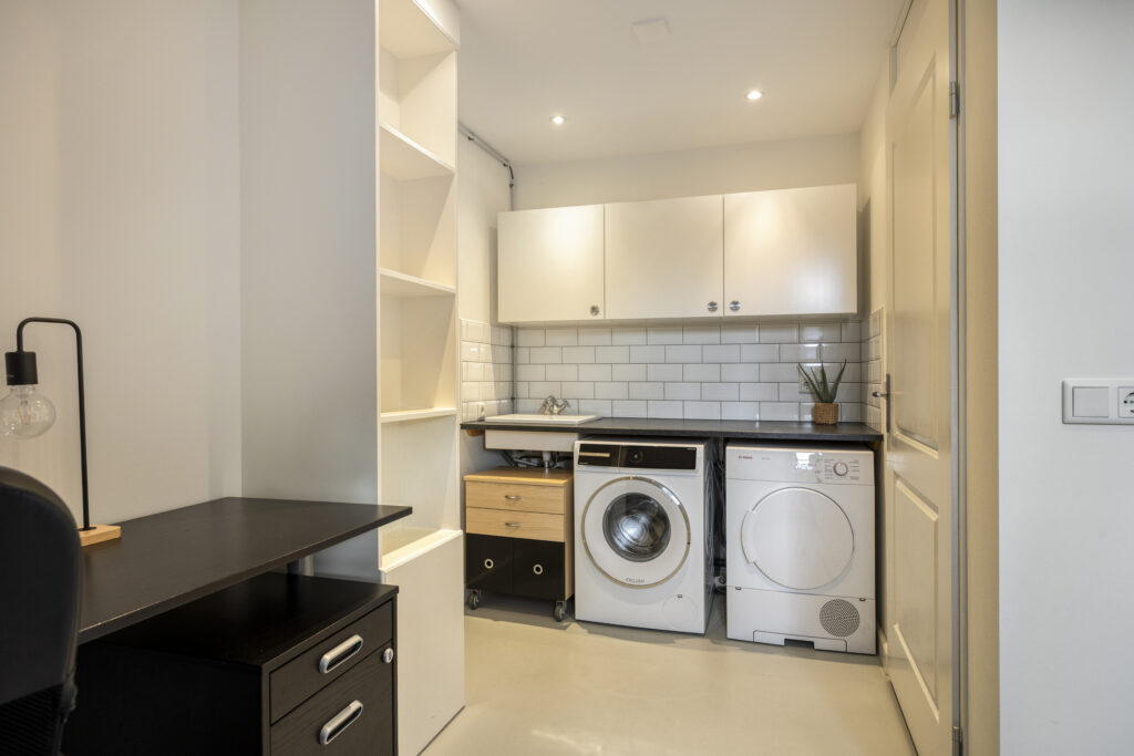 Upon entering the hallway, you immediately notice the high-quality finish of the property. The luxurious wooden floor continues seamlessly into the living room, creating a calm and stylish base. The walls and ceiling are neatly plastered. The hallway provides access to the meter cupboard, staircase and toilet.