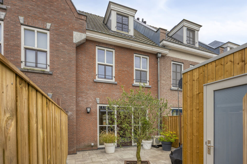 De achtertuin is onlangs volledig opnieuw aangelegd. De inrichting is verzorgd en onderhoudsvriendelijk. De grote tegels zorgen voor een strakke en moderne uitstraling. Er is ruimte voor zowel een loungehoek als een eettafel, zodat je optimaal kunt genieten van het buitenleven. De erfafscheiding (eveneens vernieuwd) van hout biedt privacy en geeft de tuin een warme sfeer.