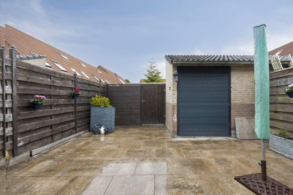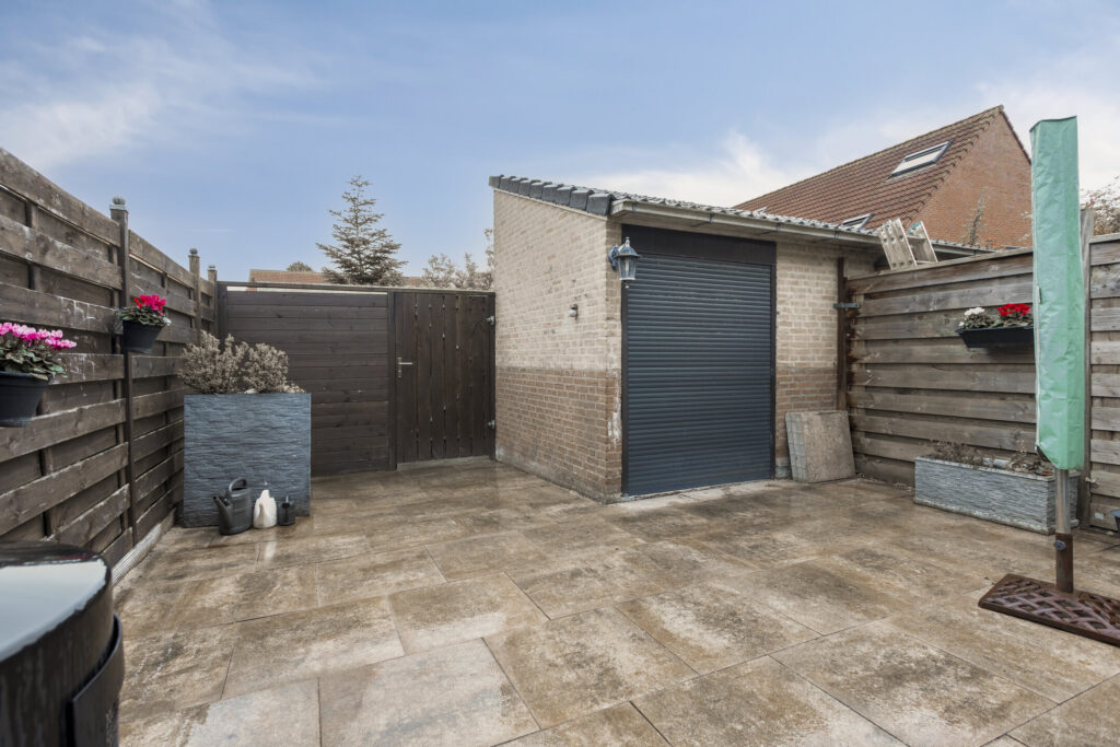 In de achtertuin staat een vrijstaande stenen schuur v.v. elektra en rolluik.