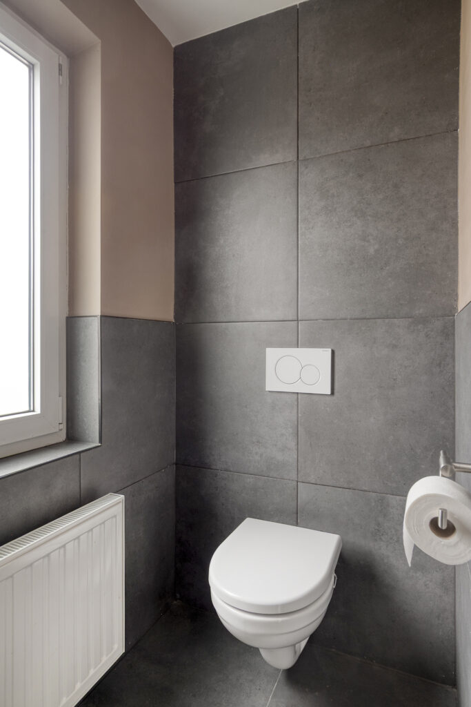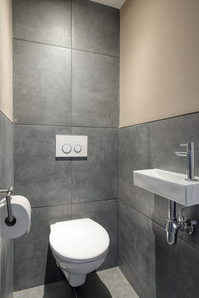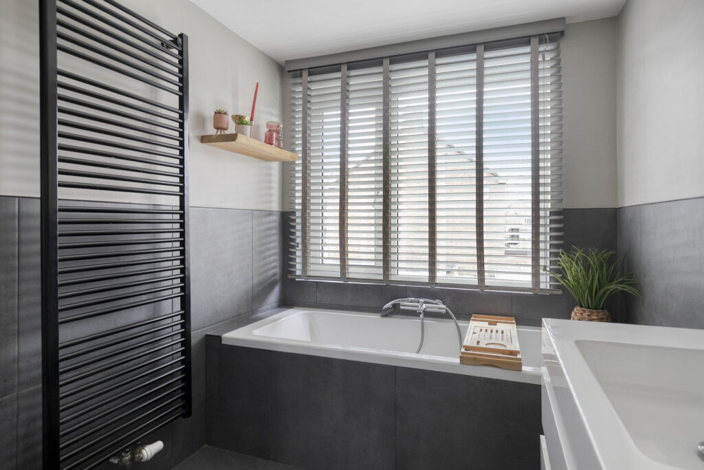De gerenoveerde badkamer is ruim van opzet en ingedeeld met een ligbad, een wastafelmeubel, een inloopdouche en een designradiator.
