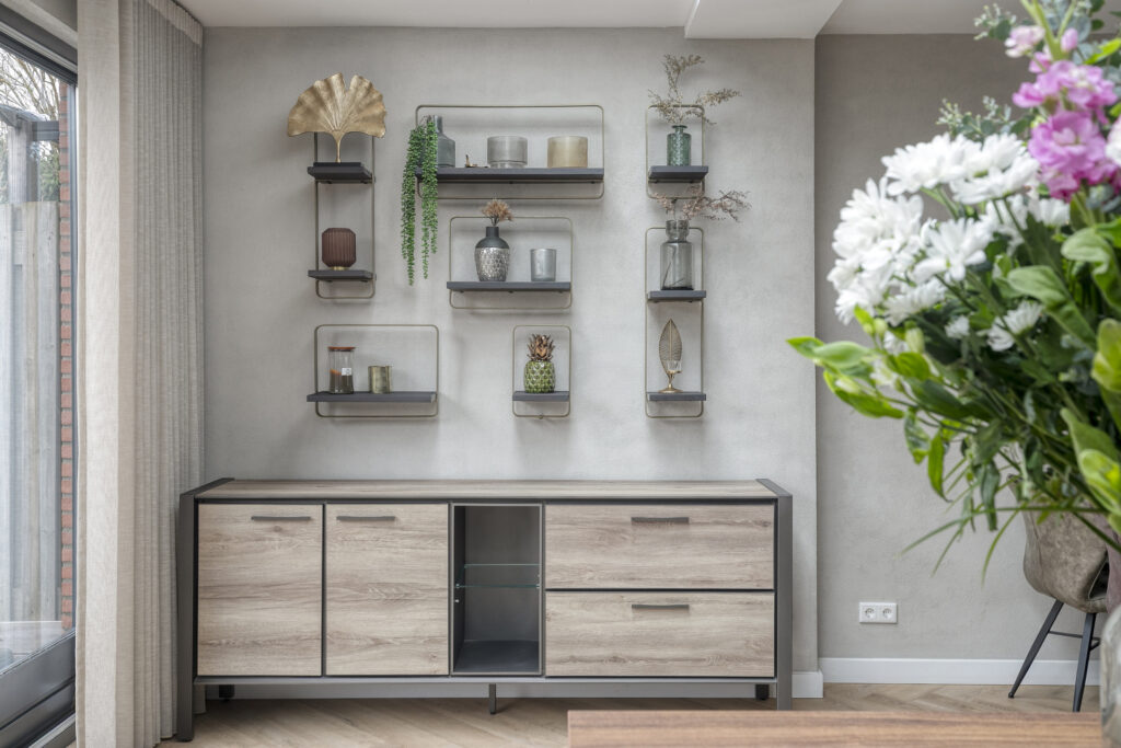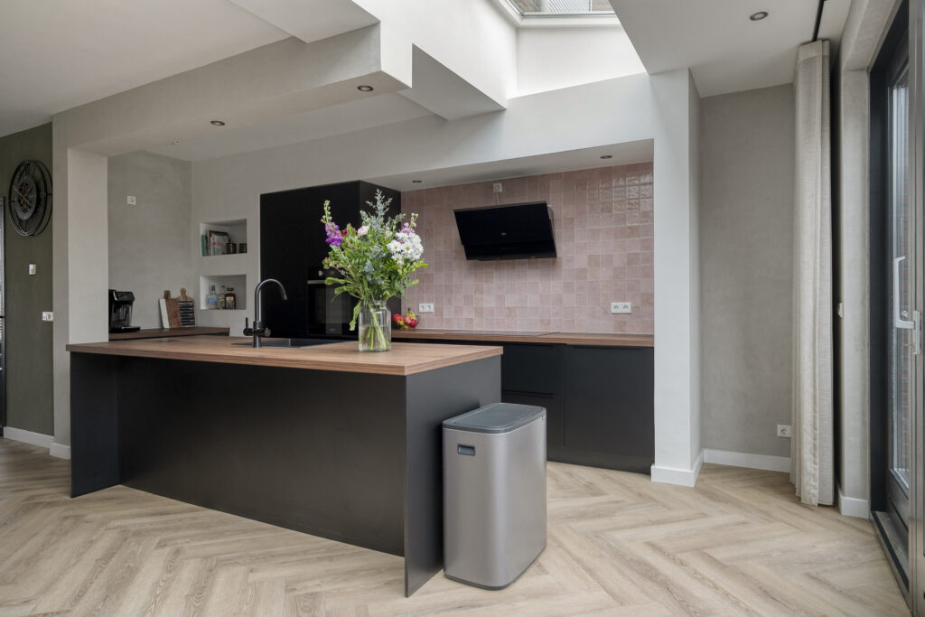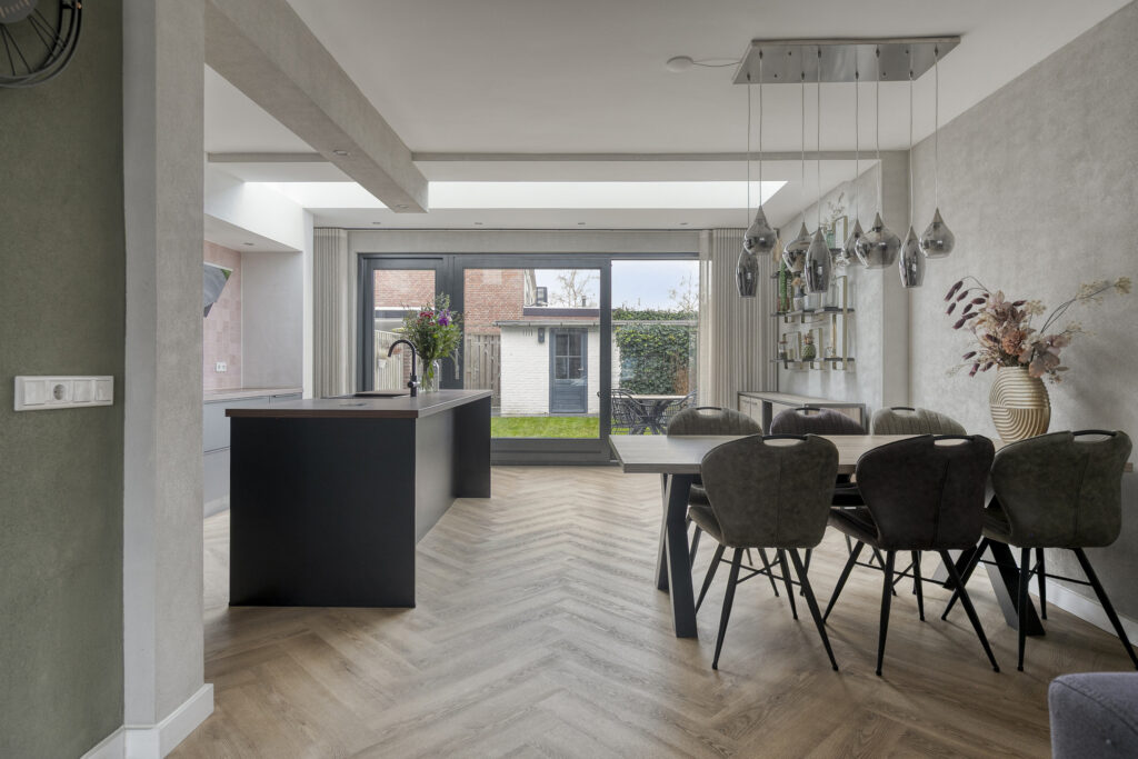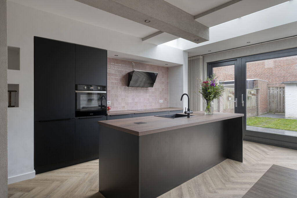 Aan de achterzijde is de woning over de volledige breedte uitgebouwd, waar de ruime woon-/leefkeuken is gerealiseerd. De keuken is geplaatst in wandopstelling met een spoeleiland en voorzien van inbouwapparatuur, te weten: vaatwasmachine, inductiekookplaat, afzuigkap, koelkast, vriezer en oven. Vanuit de achterzijde bieden zowel een schuifpui als een loopdeur toegang tot de tuin.