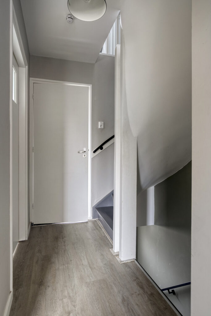 Hal/entree met trapopgang, berg-/provisiekast met meterkast (voorzien van een vernieuwde groepenkast) en doorloop naar de living.