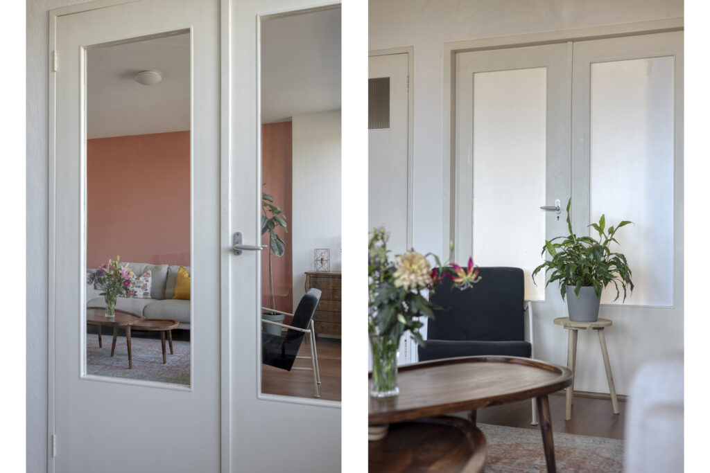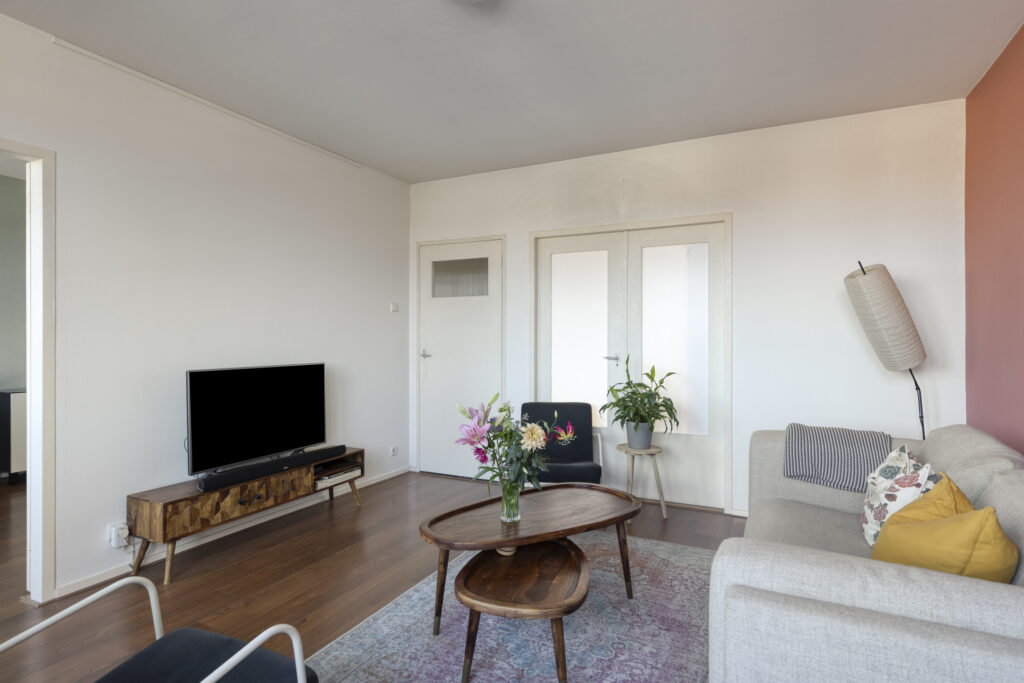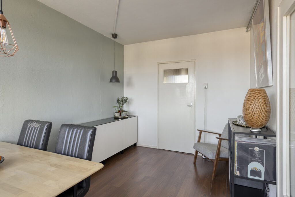 De woonkamer heeft een praktische, vrijwel vierkante indeling en laat zich daardoor eenvoudig inrichten. Vanuit de hal is er toegang tot de woonkamer, die via dubbele openslaande deuren in verbinding staat met zowel de slaapkamer als de eetkamer. De eetkamer is eveneens bereikbaar vanuit de hal en vormt samen met de woonkamer één gezellig geheel dankzij de doorlopende laminaatvloer.