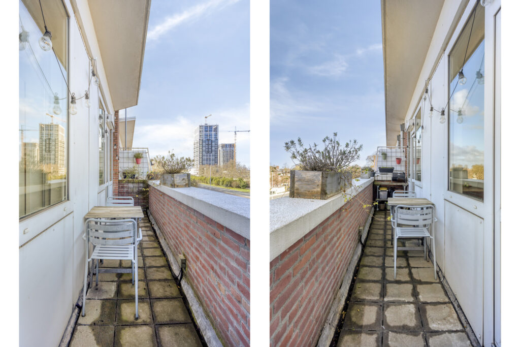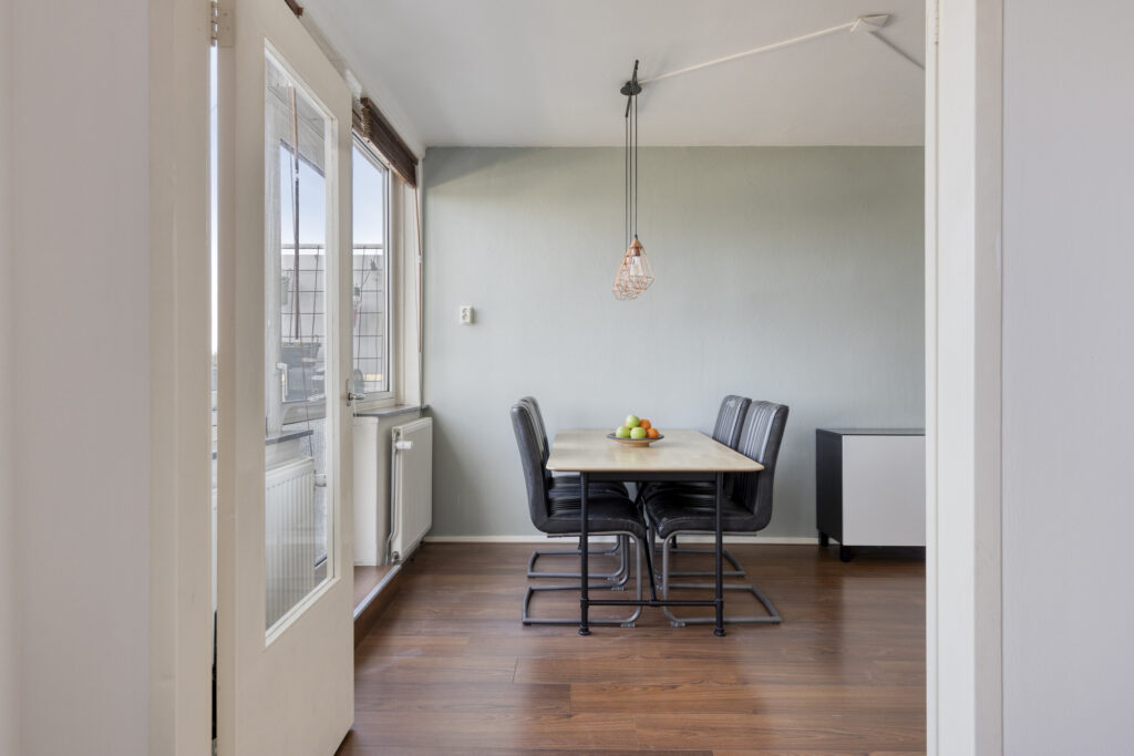 Zowel de woonkamer als de eetkamer geven toegang tot het sfeervolle balkon over de volledige breedte van de woning. Dankzij de grote raampartijen geniet u hier van veel daglicht en een fraai uitzicht over de stad.