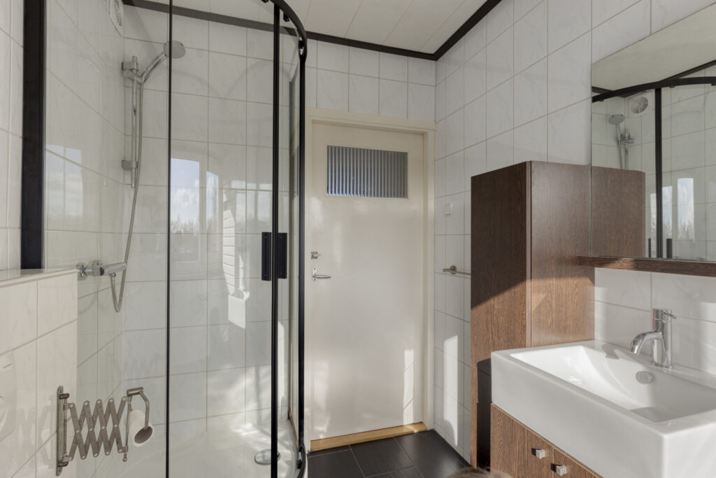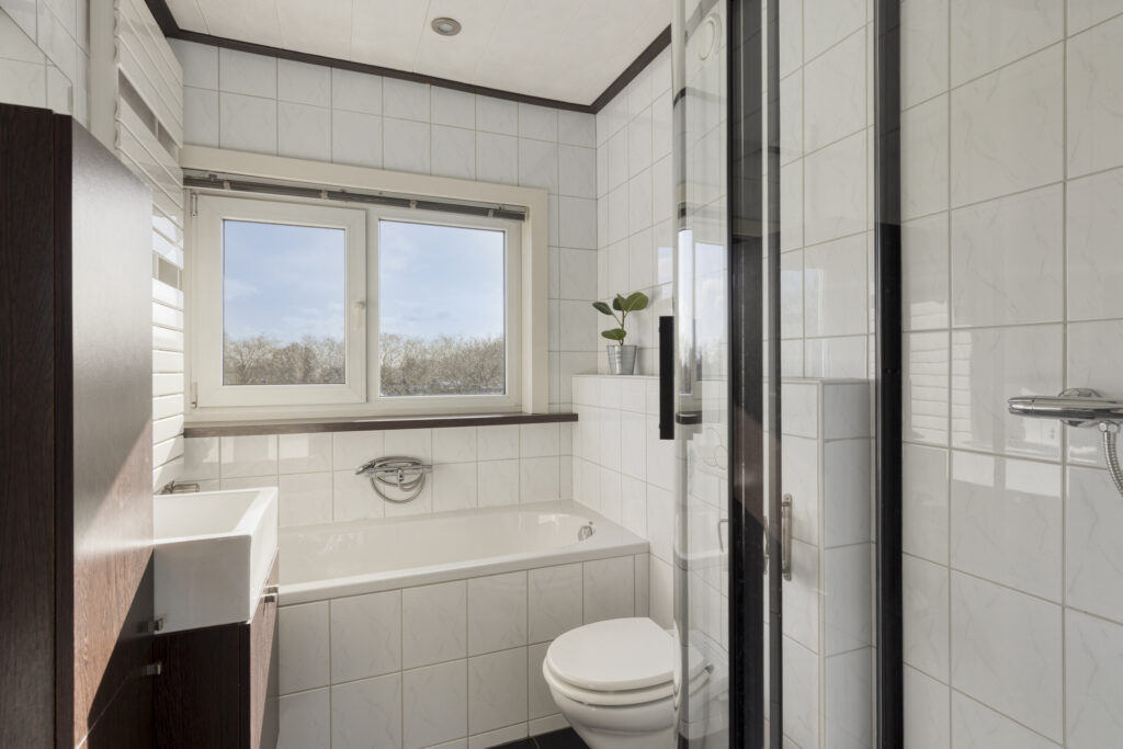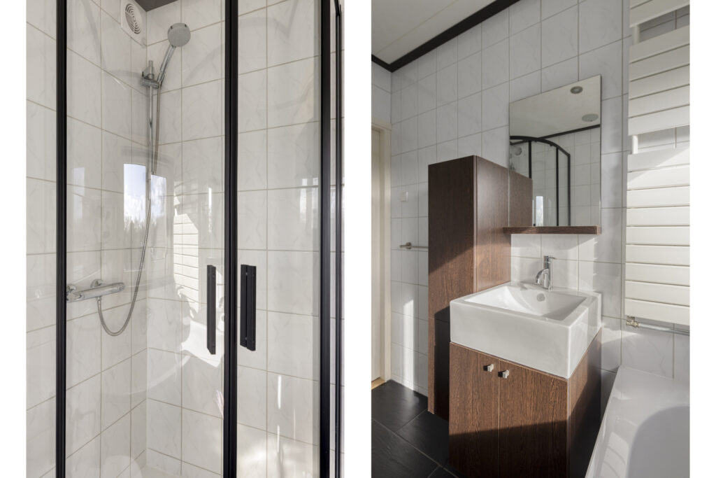 Aangrenzend bevindt zich de ruime badkamer, ingericht met ligbad, douche, wandcloset en wastafelmeubel. Fraai tegelwerk op vloer en wanden zorgt voor een verzorgde en moderne uitstraling.