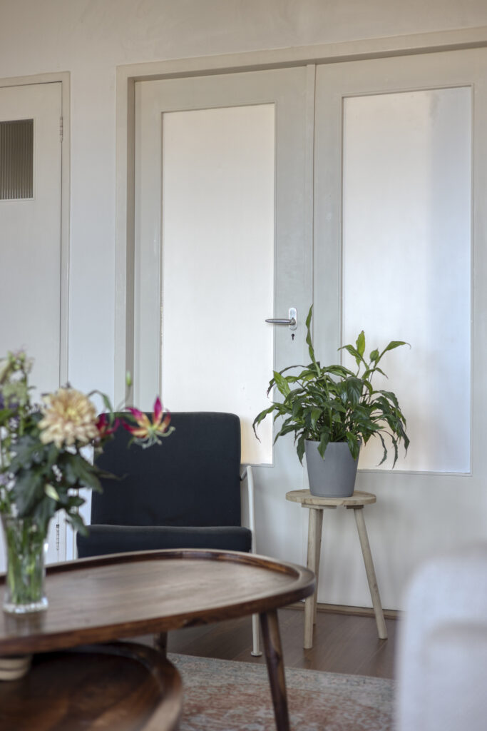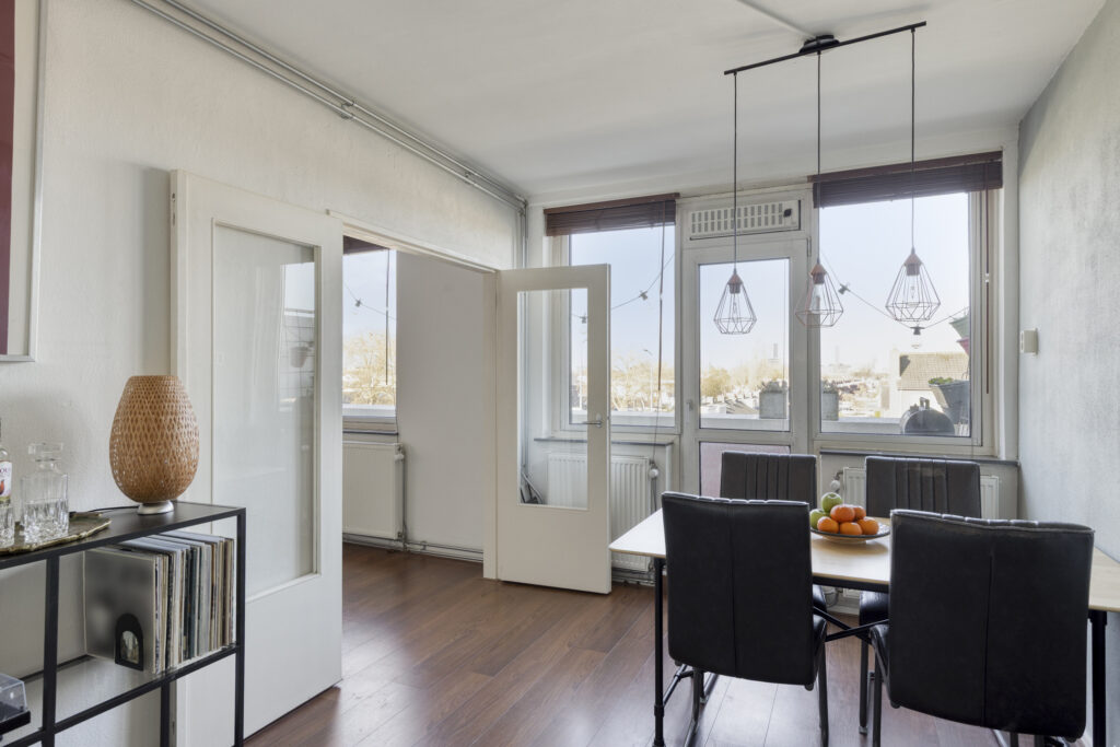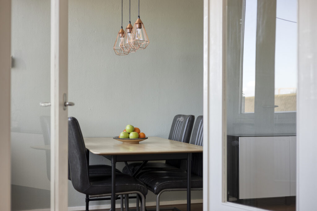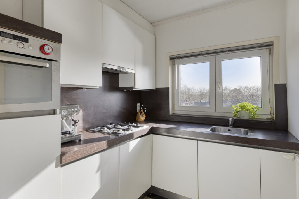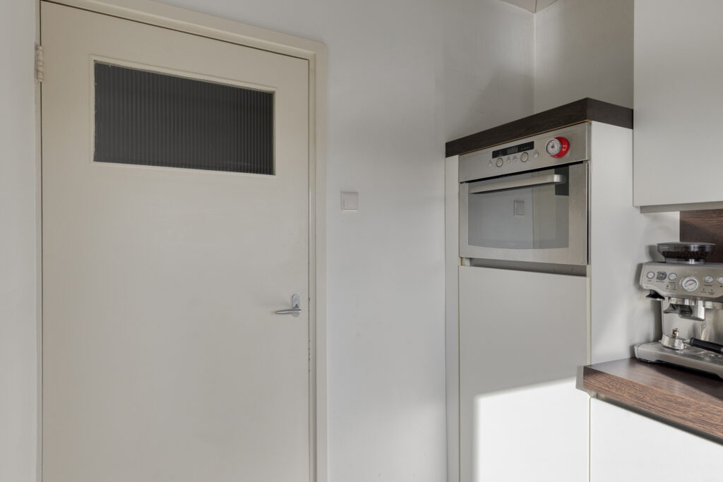 De keuken is uitgevoerd in een hoekopstelling en voorzien van een 4-pits gaskookplaat, afzuigkap, koelkast, vaatwasser en combi-oven. Vanuit het raam boven het aanrecht kijkt u uit over de daken van de achtergelegen karakteristieke jaren ’50-wijk.