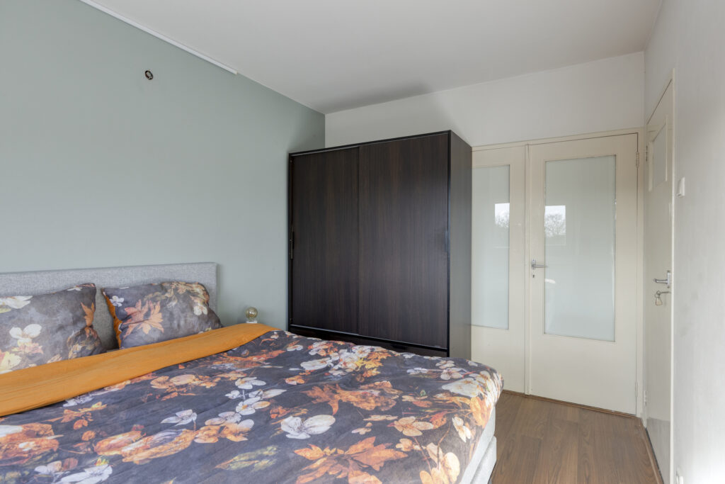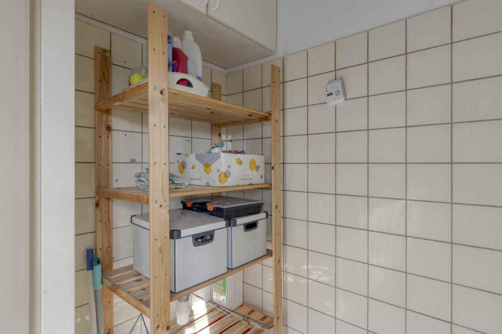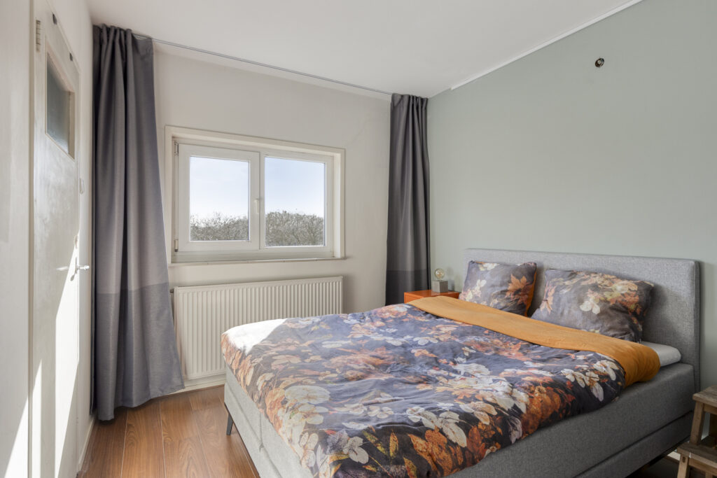 De slaapkamer ligt aan de rustige achterzijde van het gebouw, net als de keuken en badkamer. Hierdoor geniet u van een rustige nachtrust, ook met geopend raam. De slaapkamer beschikt over een nette laminaatvloer en geeft toegang tot de praktische cv-/wasruimte.