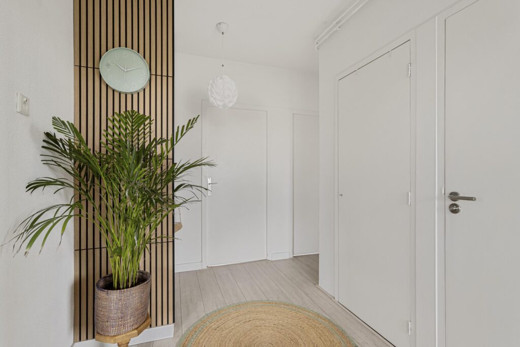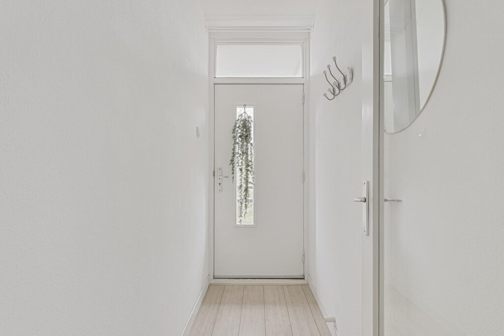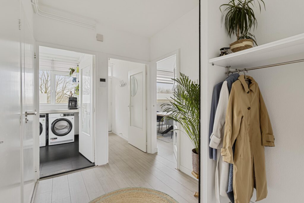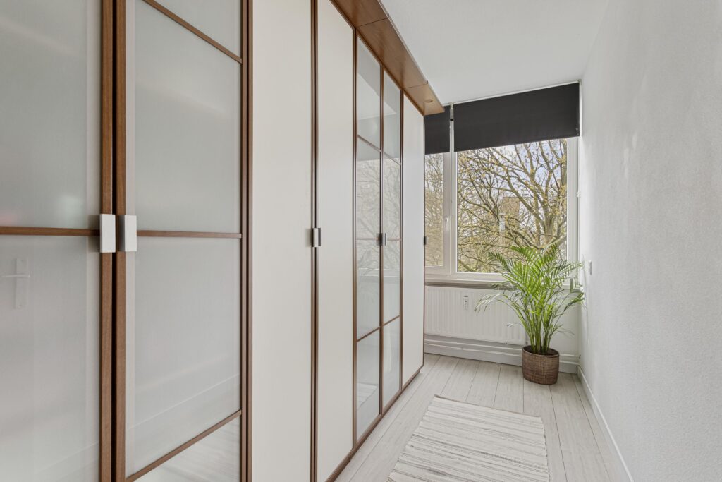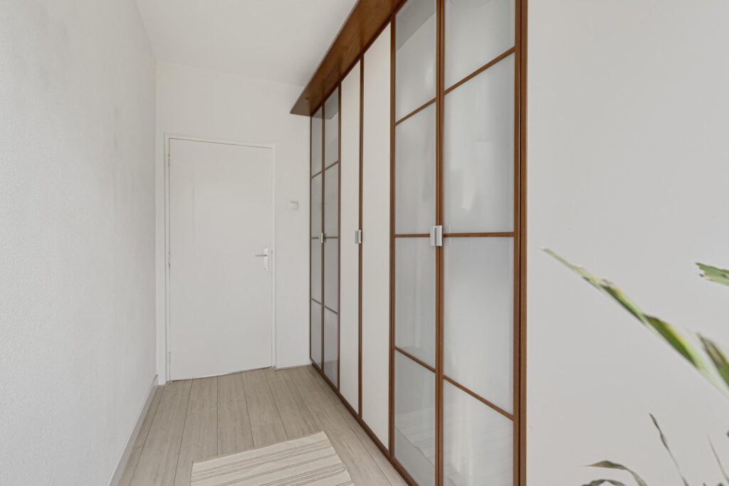 Via de galerij bereik je de voordeur van het appartement, deze geeft toegang tot de hal. Vanuit de hal zijn alle vertrekken van het appartement bereikbaar. In de hal bevinden zich daarnaast ook de meterkast (8 groepen + 2 aardlekschakelaars).