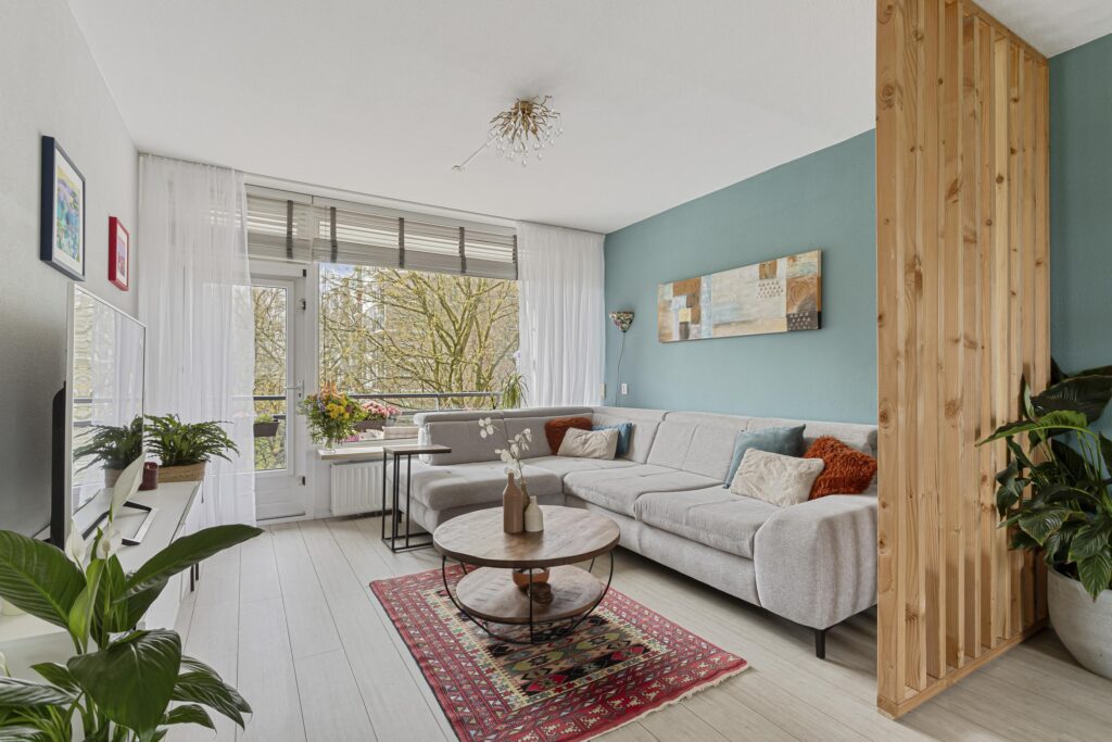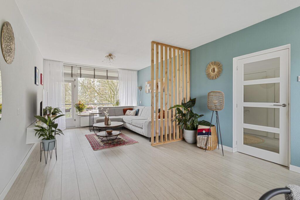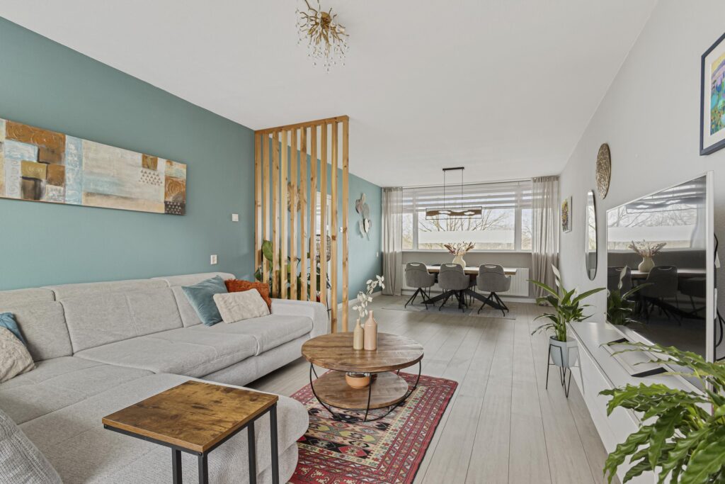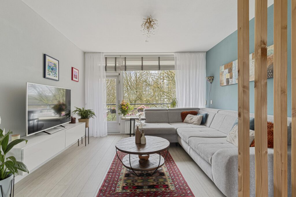 De ruime doorzonkamer (ca. 32m²) met veel lichtinval is voorzien van een laminaatvloer, strakke wand- en plafondafwerking en een fraaie roomdevider. Vanuit de woon-/eetkamer kan het balkon, welke is gelegen op het zonnige zuiden en vrij uitzicht heeft over een natuurrijke omgeving, worden bereikt. Het balkon beschikt over een zonnescherm.