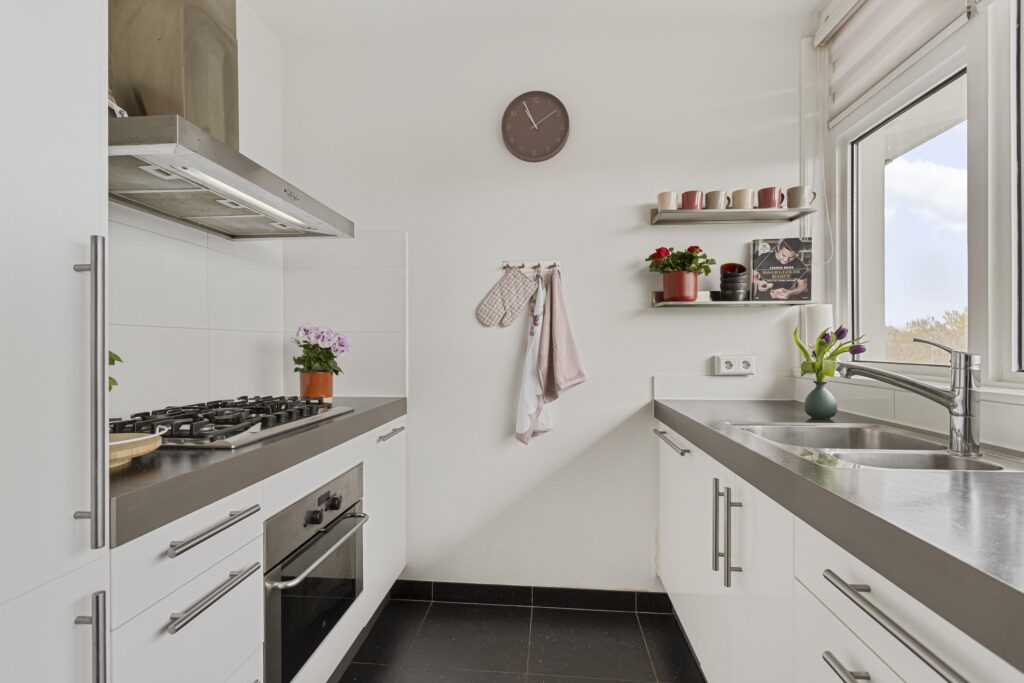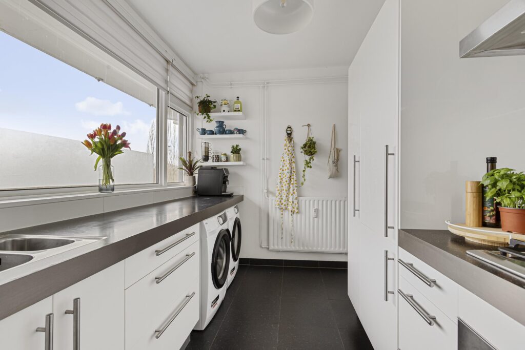 De complete keuken in tweetal wandopstellingen is bereikbaar vanuit de hal en voorzien van o.a. een 1,5 spoelbak, een 5-pits gaskookplaat, rvs afzuigschouw, combi-oven, koelkast, vriezer met 3 lades, vaatwasmachine en genoeg opbergruimte. Daarnaast bevinden zich in de keuken tevens de aansluitingen ten behoeve van de wasapparatuur.