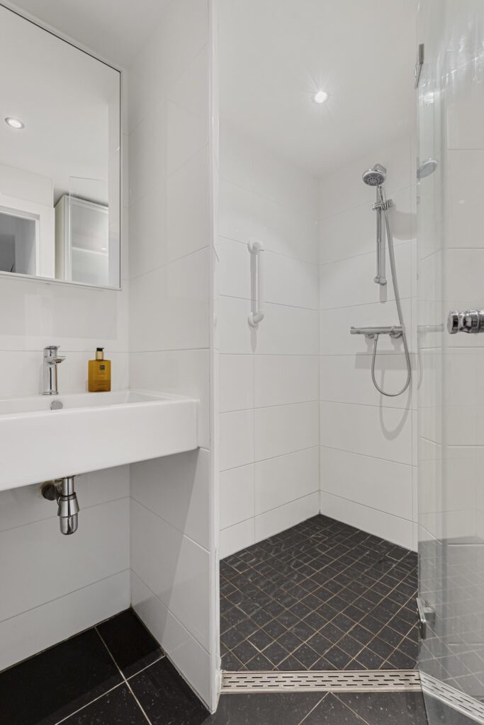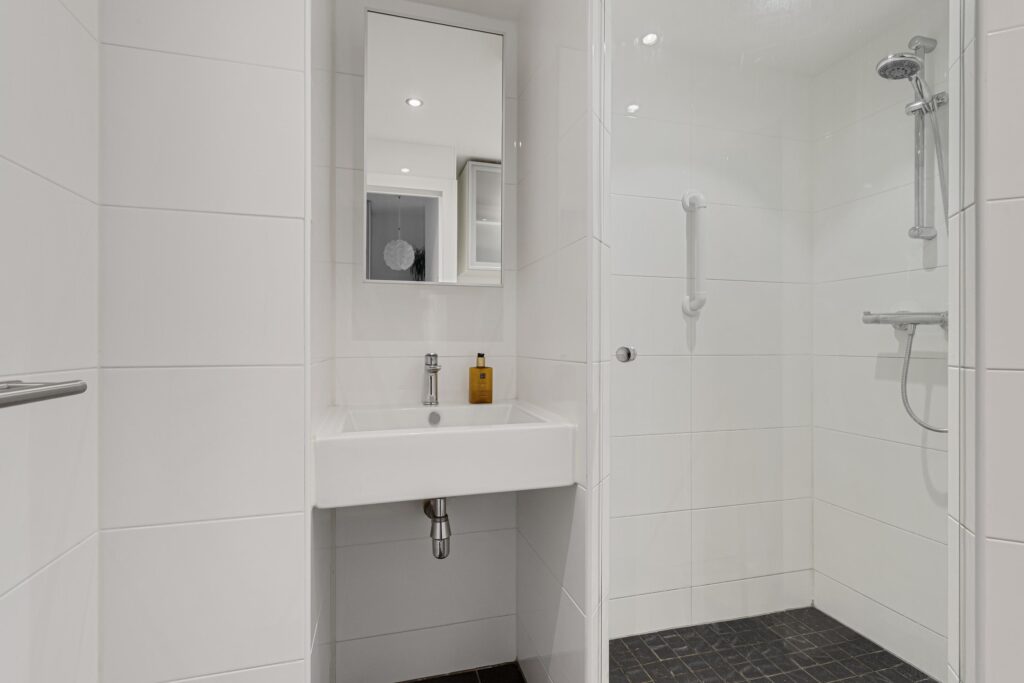 De moderne badkamer is bereikbaar via de hal en beschikt over een inloopdouche, een wastafel met meubel, mechanische ventilatie en inbouwspots.