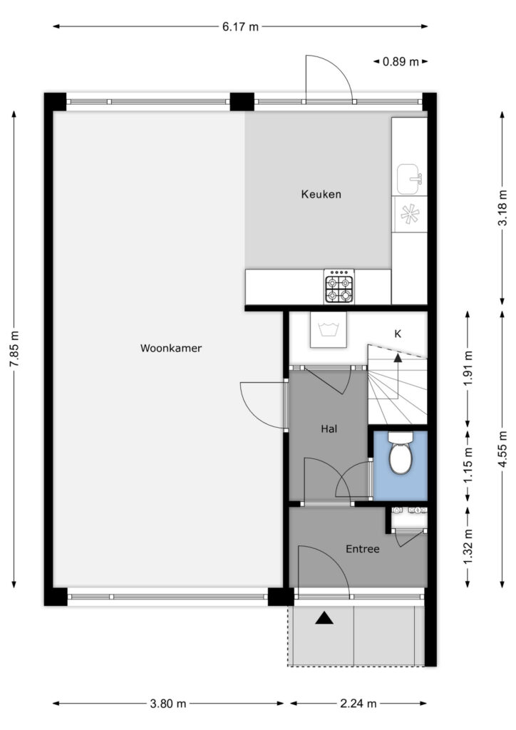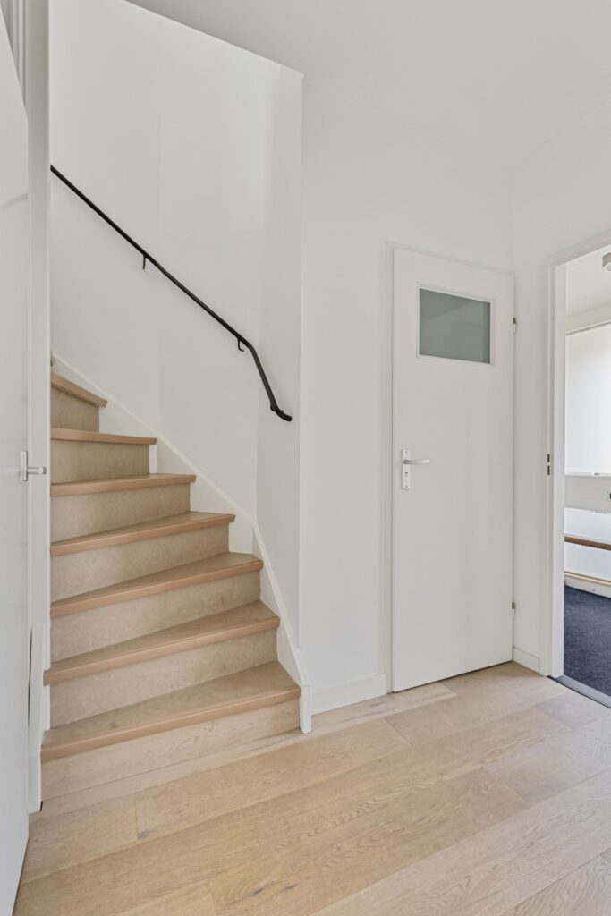 Vanuit de hal zijn de woonkamer, toiletruimte, trapopgang naar de eerste verdieping en een royale berg-/trapkast te bereiken.