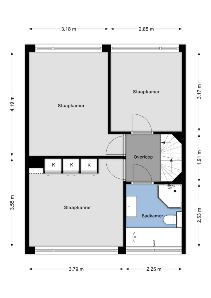 Overloop met toegang tot de 3 slaapkamers, badkamer en de vaste trap naar de tweede verdieping.