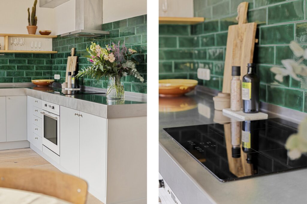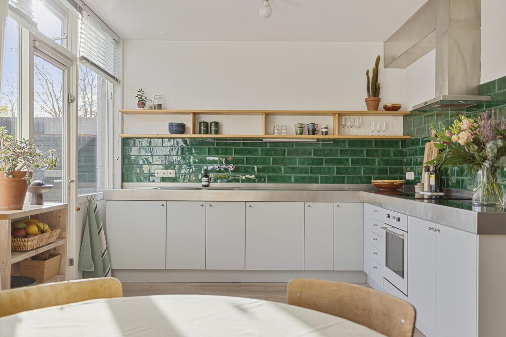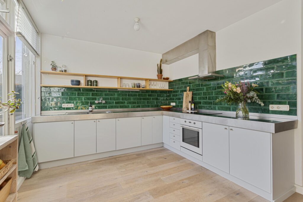 De open keuken in hoekopstelling is van alle gemakken voorzien waaronder een 4-pits inductiekookplaat, koelkast, vriezer, pannencarrousel, spoelbak, oven en diverse lades/kasten. Vanuit de keuken is direct tuincontact mogelijk middels de toegangsdeur.