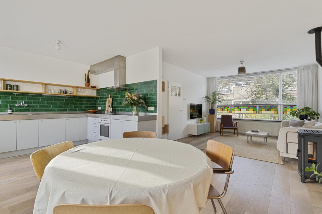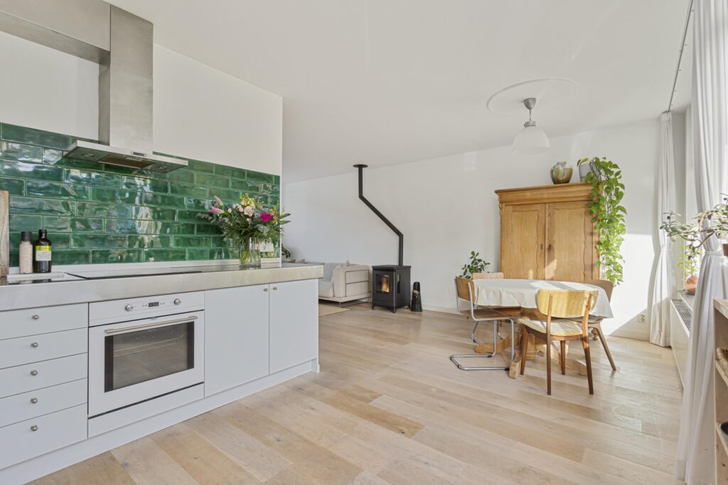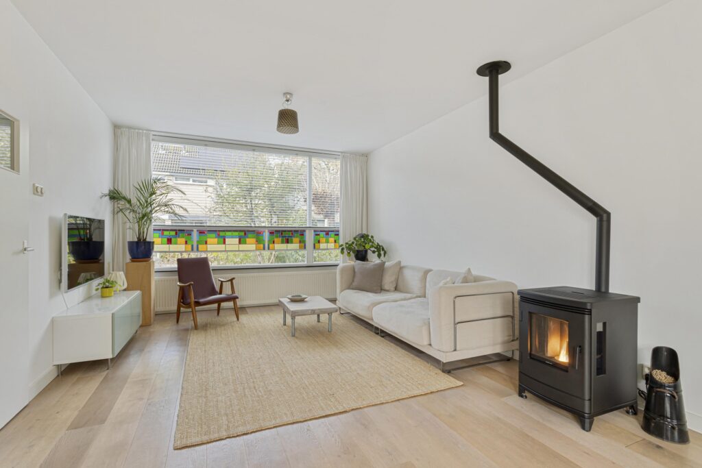 Zeer sfeervolle woonkamer (ca. 30m².) met fraaie multi-plank houten vloer, strakke wand- en plafondafwerking en stijlvolle pelletkachel (ter overname). De woonkamer geniet erg veel lichtinval middels de grote raampartijen waardoor het de ruimte eveneens een zeer ruimtelijk effect geeft en staat aan de achterzijde in open verbinding met de keuken.