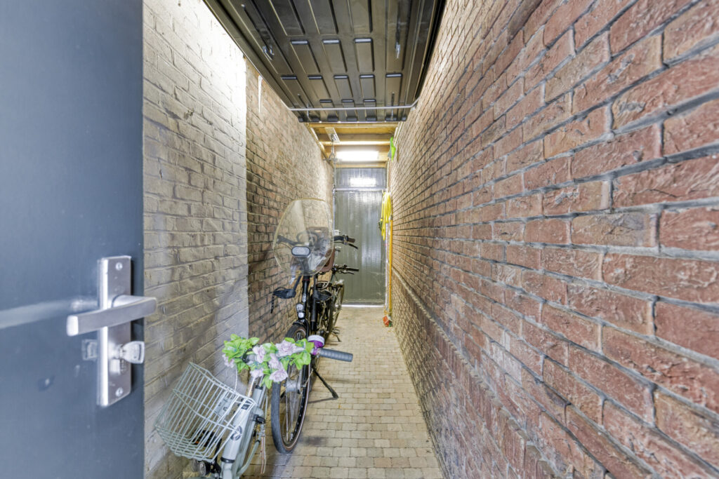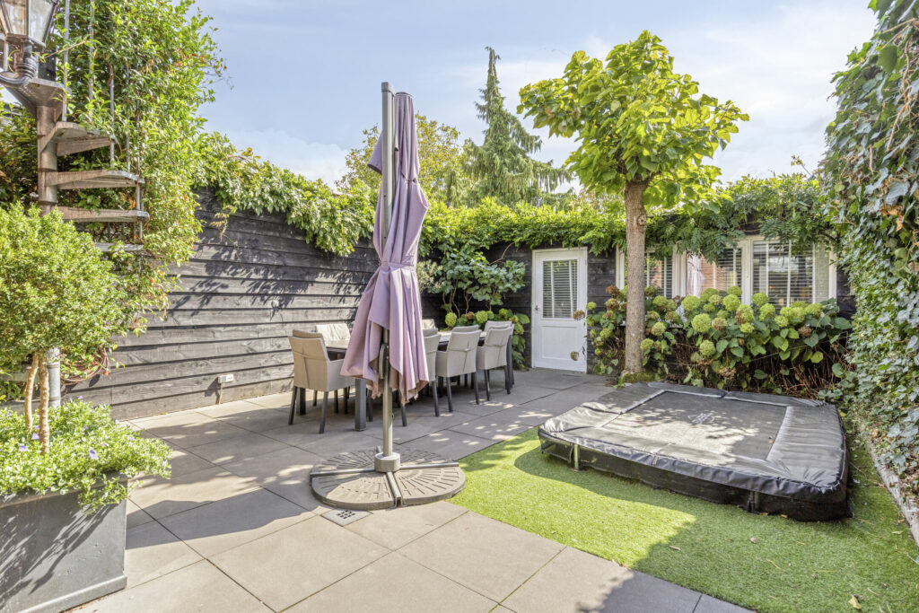 De woning heeft een kleine stadstuin aan de voorzijde. Naast de woning ligt de poort welke toegang geeft tot de overdekte berging. Daarbij is er een loopdeur naar de keuken aanwezig. Aan de achterzijde is de tuin geheel omsloten en biedt deze volop privacy. Gezien de ligging op het zuiden geniet je daarbij van veel zon.