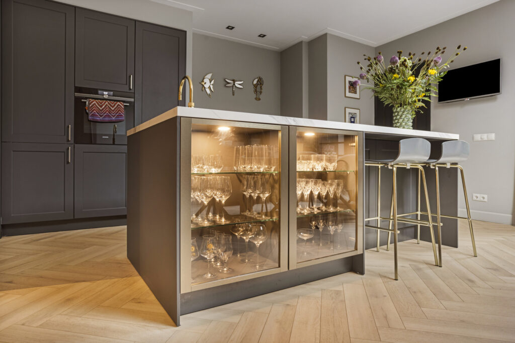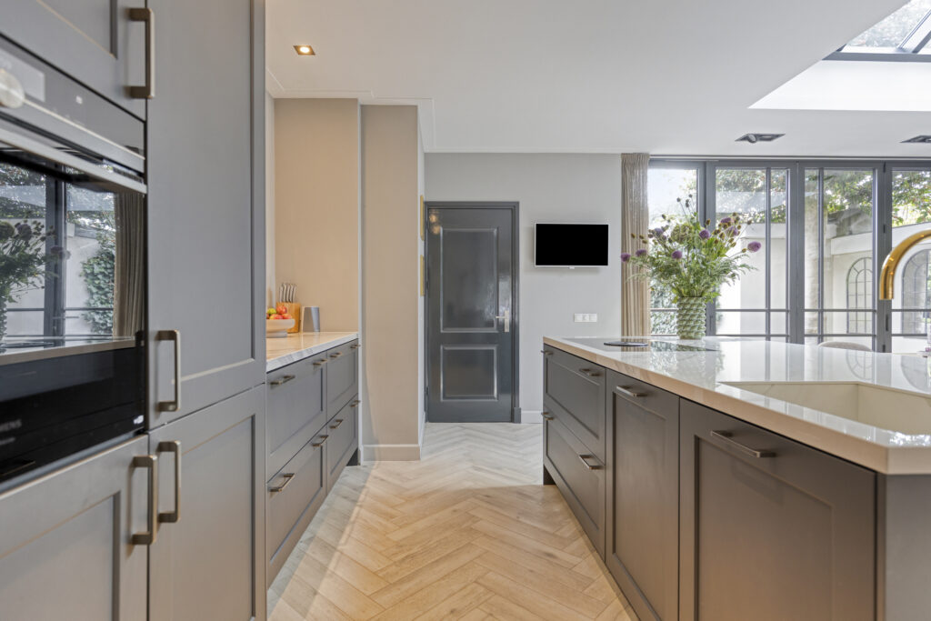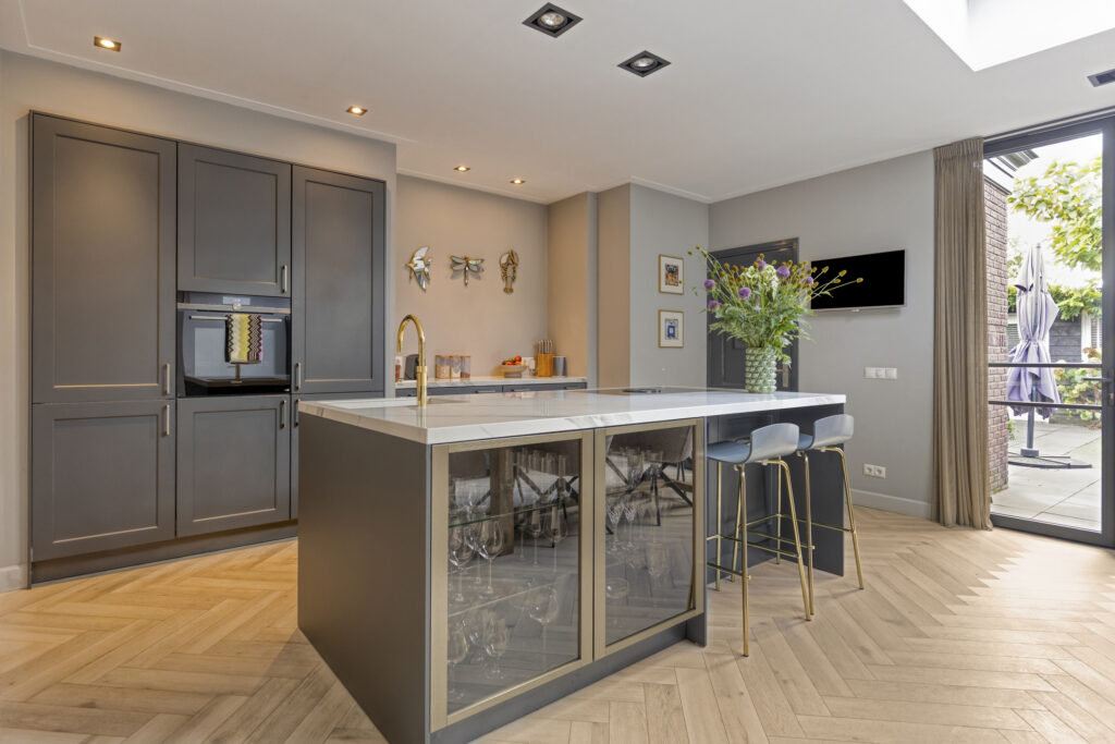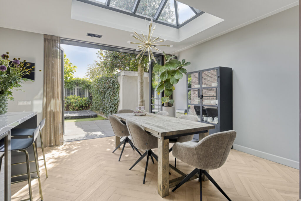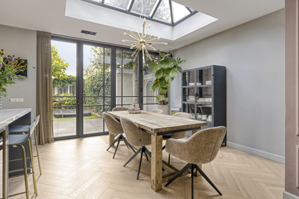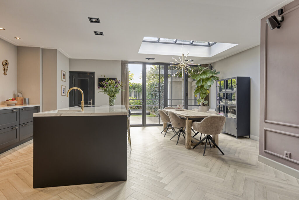 De luxe Siematic-keuken, met Dekton werkblad, bestaat uit een hoge kastenwand, een extra werkblad/coffeecorner en een kook-/spoeleiland. De keuken is voorzien van hoogwaardige (Siemens) keukenapparatuur, waaronder een Bora-inductiekookplaat met middenafzuiging, een Quooker, vaatwasmachine, koelkast, vriezer en een stoomoven. De uitbouw is met oog voor detail gerealiseerd en door de aluminium lichtstraat en harmonica-/seizoenspui geniet je van optimale lichtinval. Bovendien kan deze pui geheel worden geopend waardoor je het gevoel van buitenleven naar binnen haalt.
