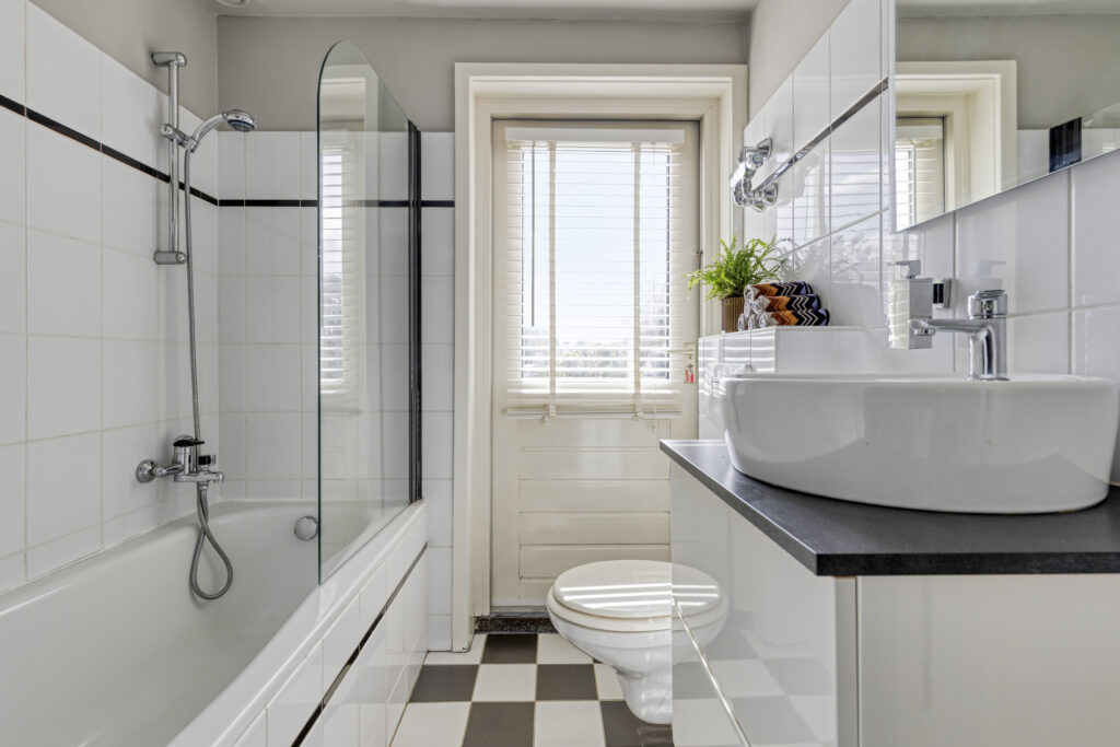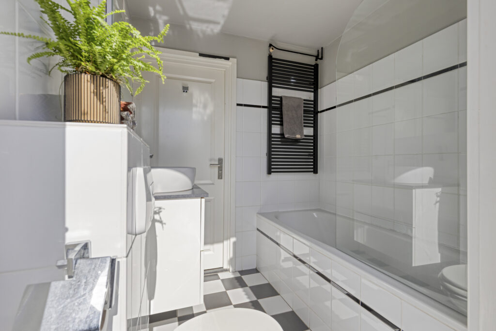 De geheel betegelde badkamer is ingedeeld met een ligbad met douchehoek, een wastafelmeubel en wandcloset. Vanuit de badkamer geeft een loopdeur toegang tot het platte dak.