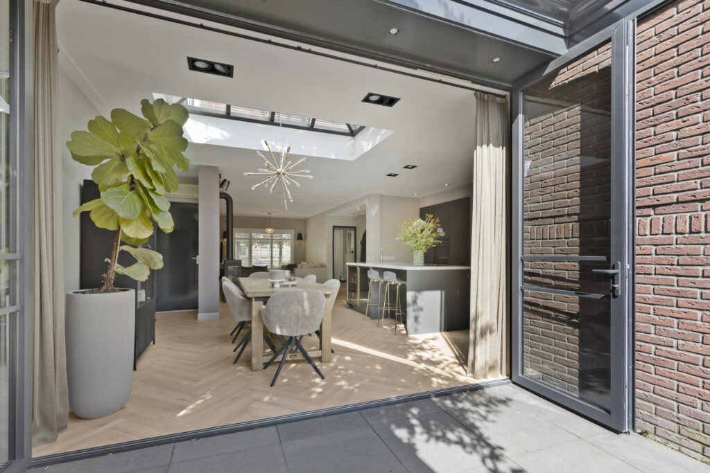 – Aan achterzijde over de volledige breedte uitgebouwd en voorzien van een harmonica-/seizoenspui welke geheel kan worden geopend;