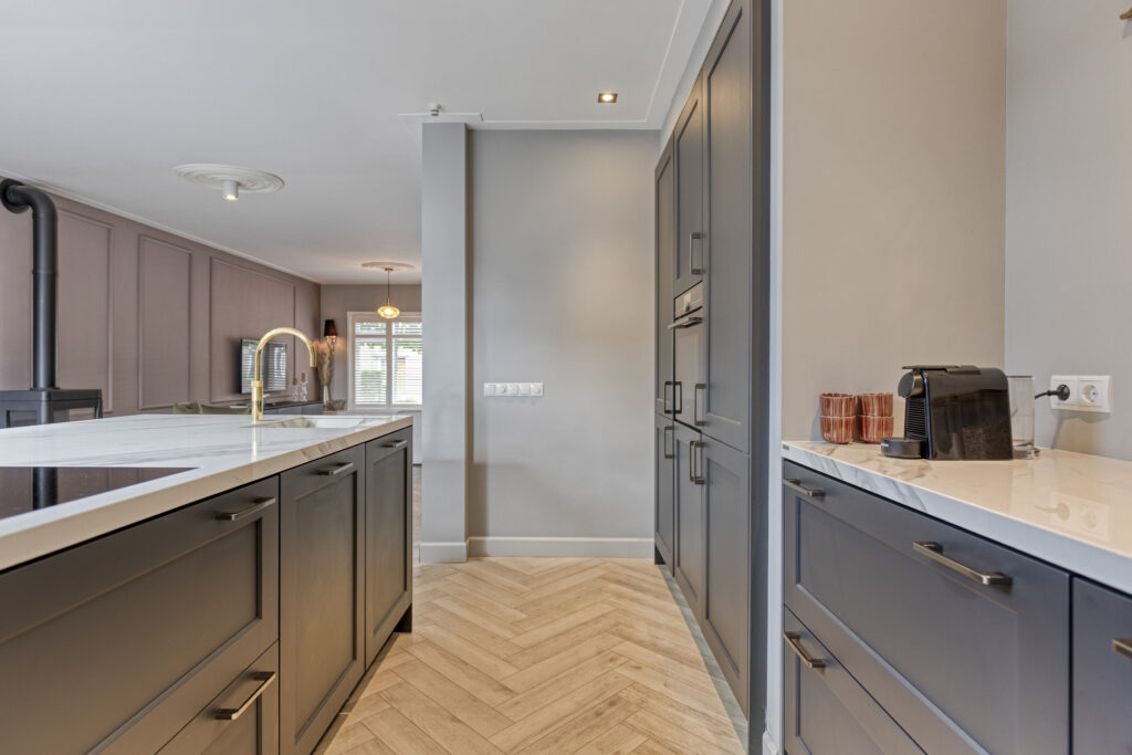 Ruime living met aan de voorzijde de woonkamer, welke is voorzien van een sfeervolle haardpartij. Halverwege tref je de praktische berg-/provisiekast met meterkast (voorzien van een vernieuwde groepenkast). Hier bevindt zich ook de verdeler t.b.v. de vloerverwarming. Aan de achterzijde is de woning over de volledige breedte voorzien van een uitbouw. Hierdoor is er een royale woon-leefkeuken ontstaan.