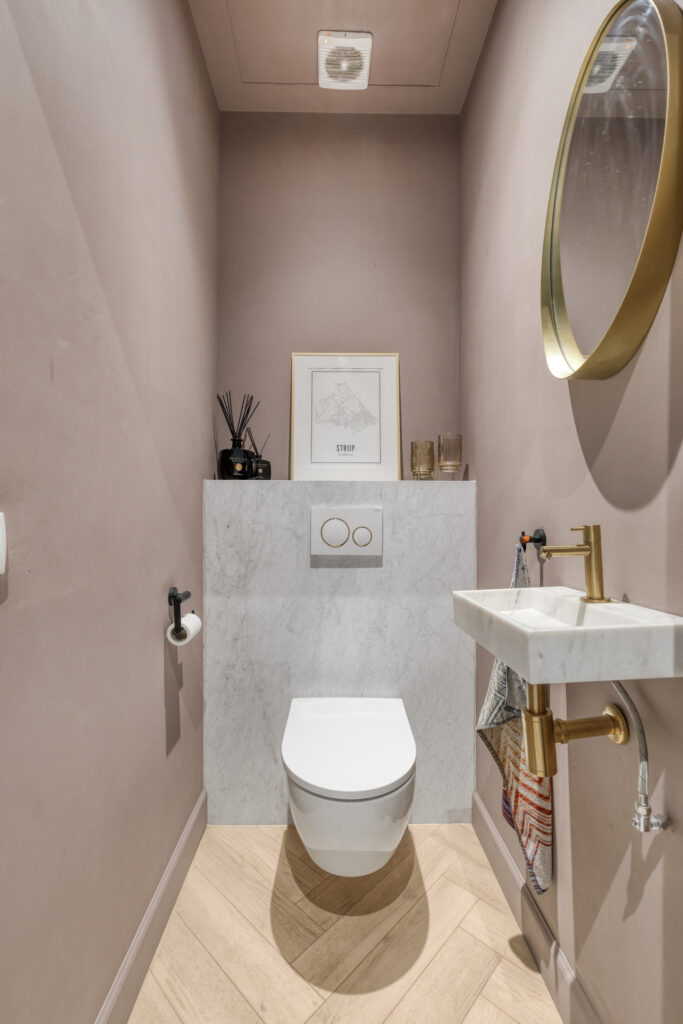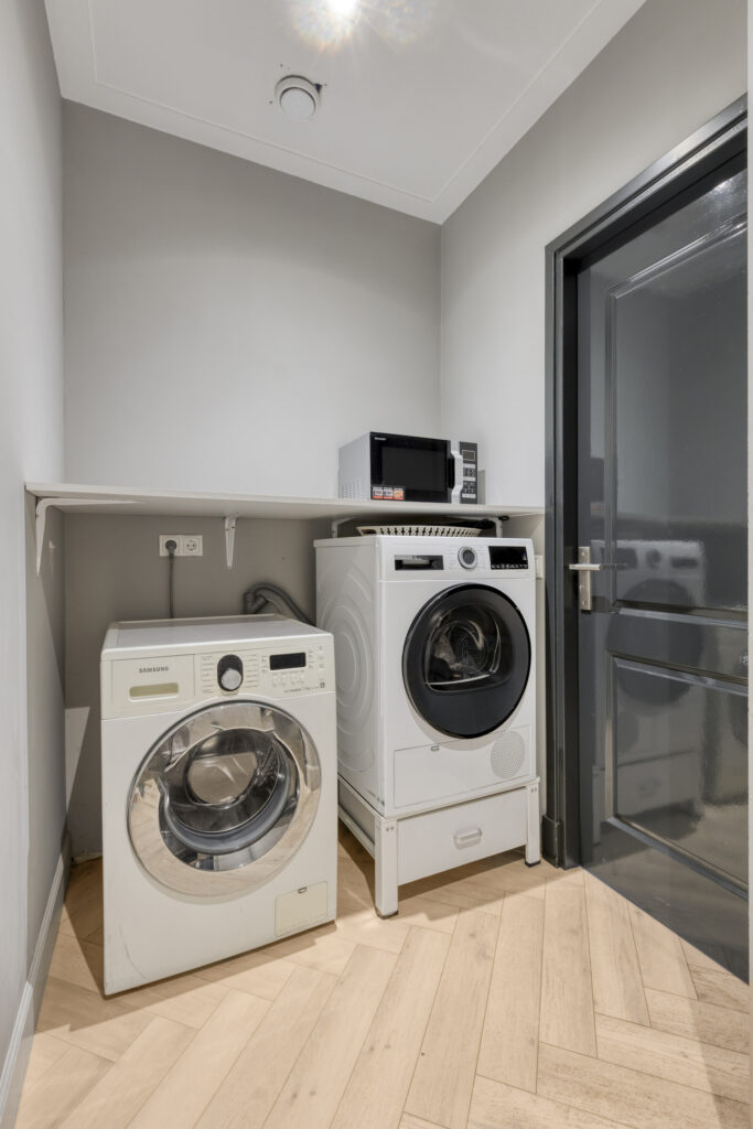 Vanuit de keuken heb je toegang tot een portaaltje met aansluitingen voor was- en droogvoorzieningen. Vanuit dit portaaltje loop je door naar de toiletruimte met wandcloset en fonteintje.