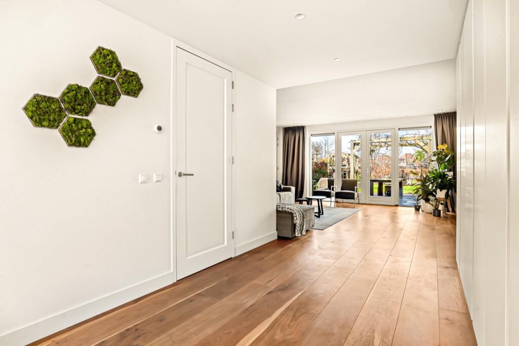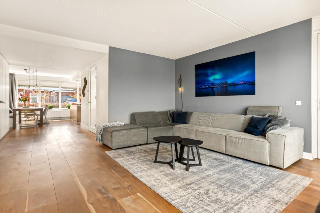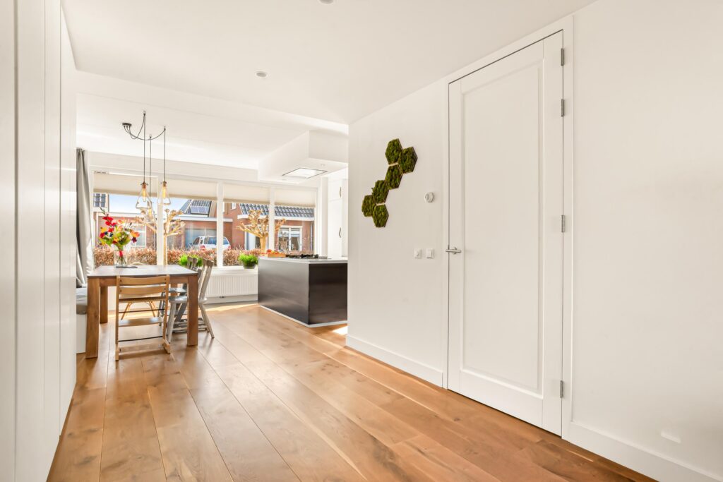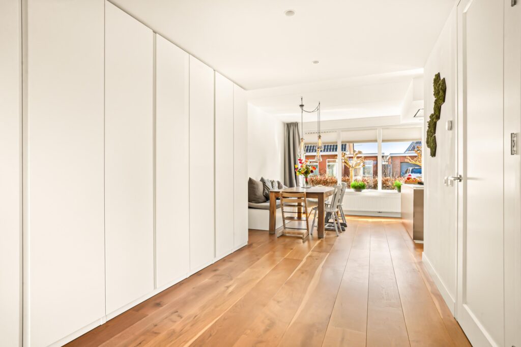 Bij aankomst parkeert u moeiteloos op uw eigen oprit voor de verlengde garage. De woning verwelkomt u via de zij-entree in een lichte hal met toilet, garderobe en trapopgang. Vanuit hier betreedt u de sfeervolle leefruimte, waar de fraaie eikenhouten vloer naadloos doorloopt in de woonkamer en open keuken.