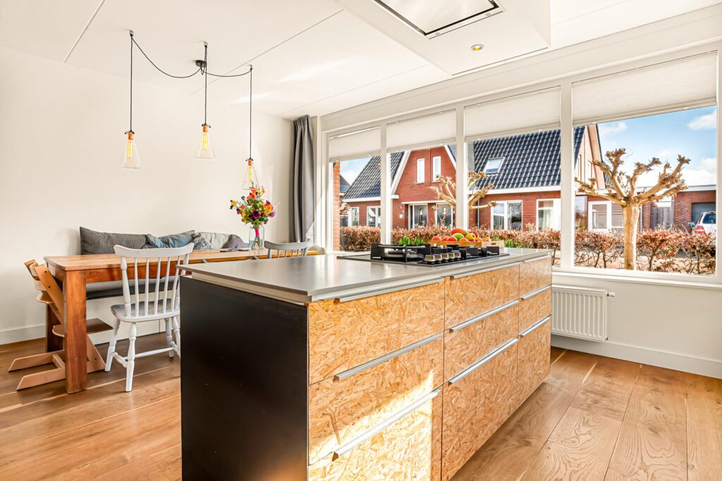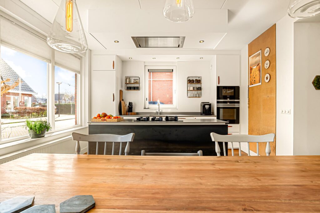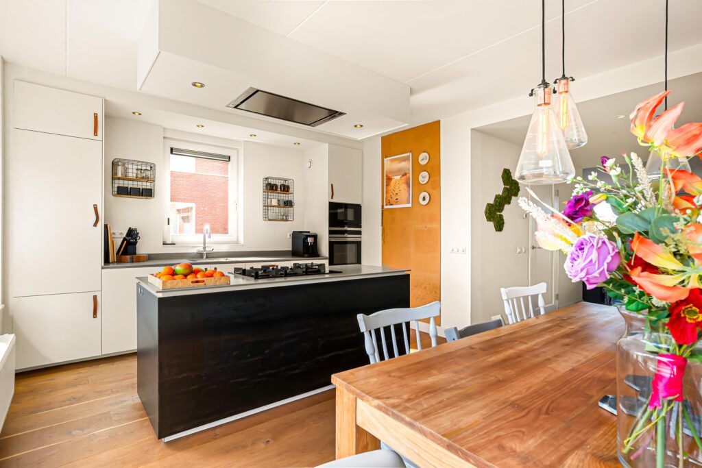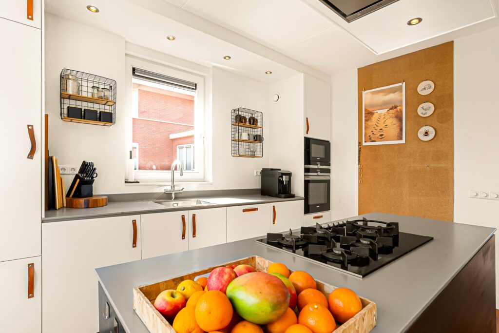 Aan de voorzijde van de woning bevindt zich de moderne open keuken, compleet met kookeiland en een rechte opstelling voorzien van diverse inbouwapparatuur. Hier is volop ruimte voor een gezellige eettafel — dé plek om samen te komen.