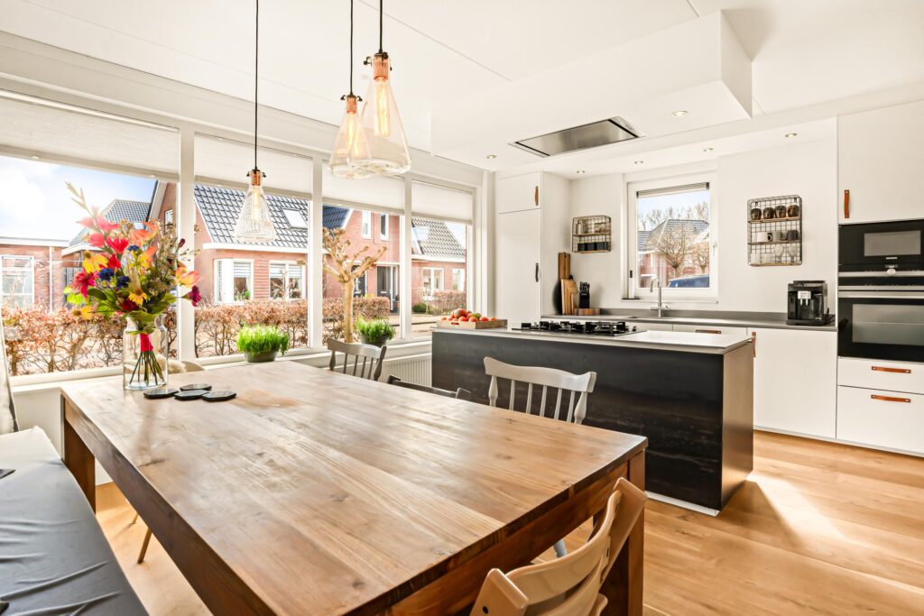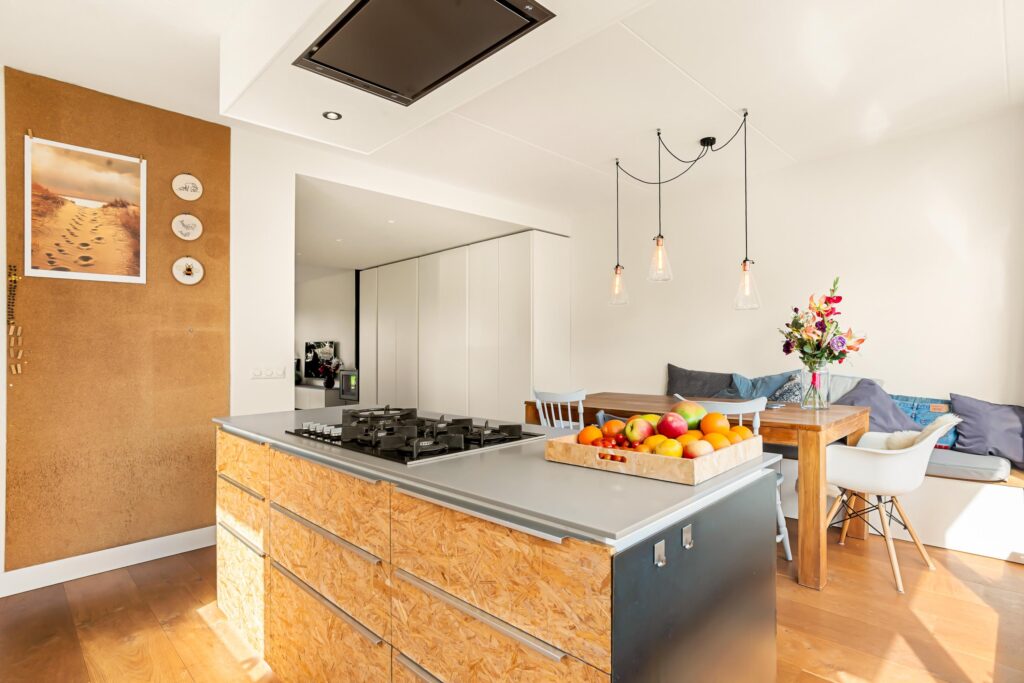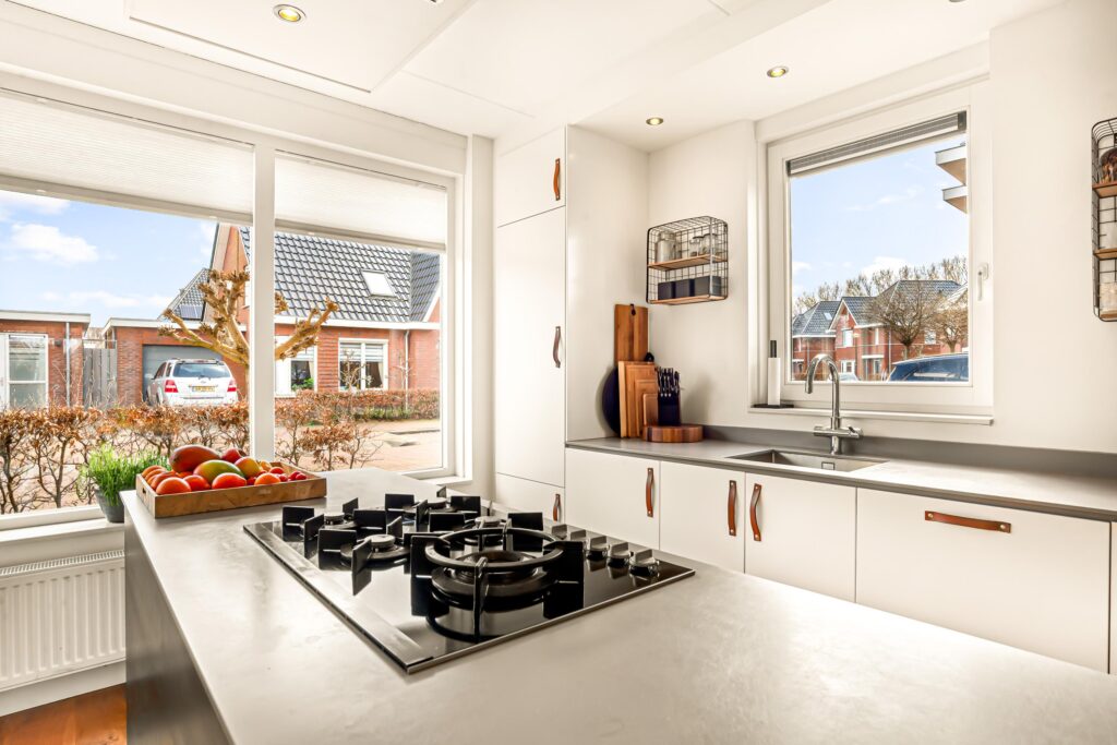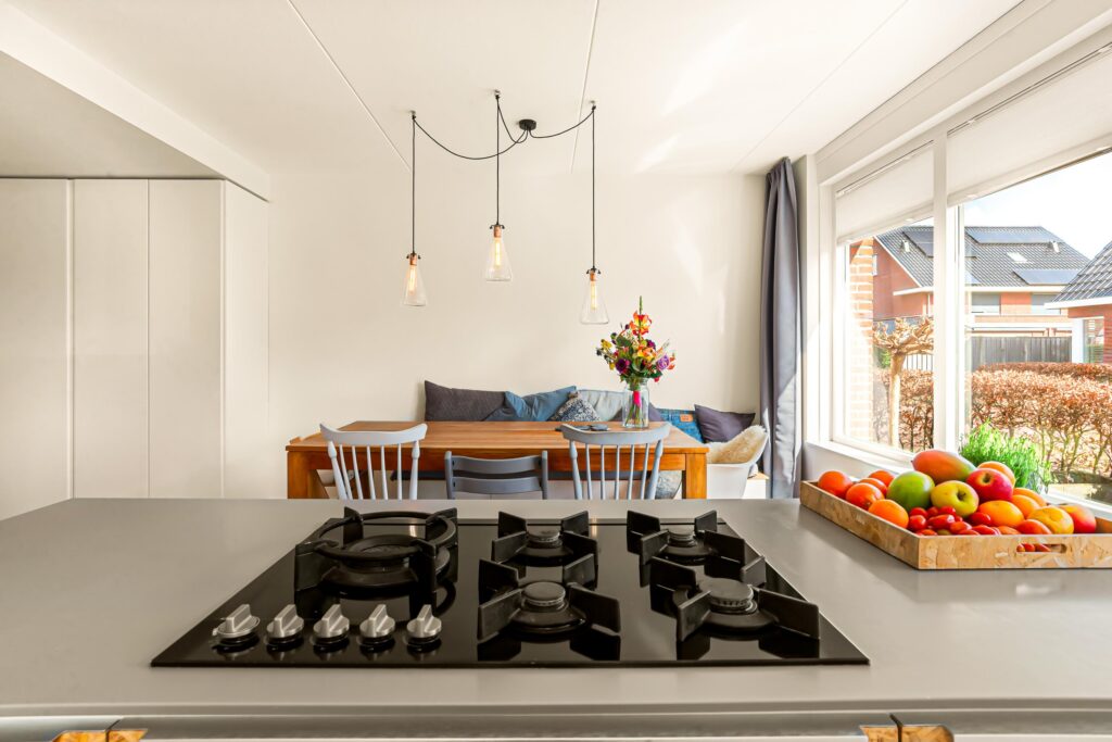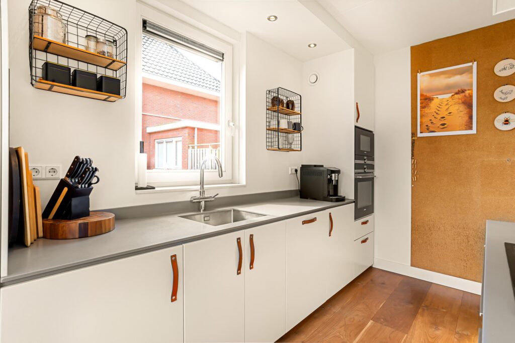 Aan de voorzijde van de woning bevindt zich de moderne open keuken, compleet met kookeiland en een rechte opstelling voorzien van diverse inbouwapparatuur. Hier is volop ruimte voor een gezellige eettafel — dé plek om samen te komen.