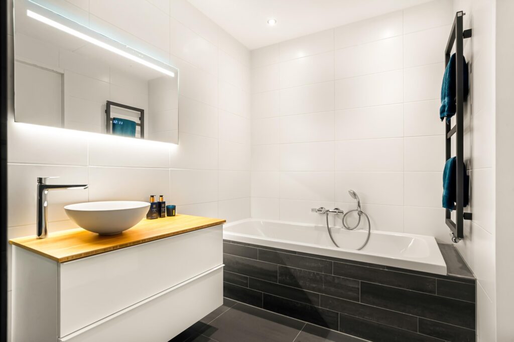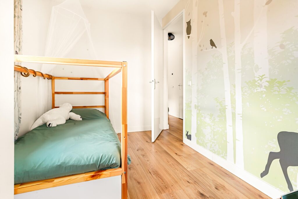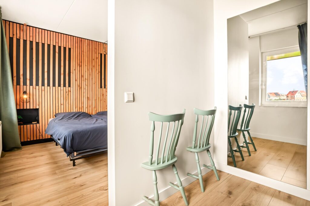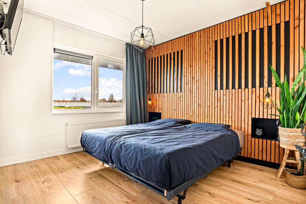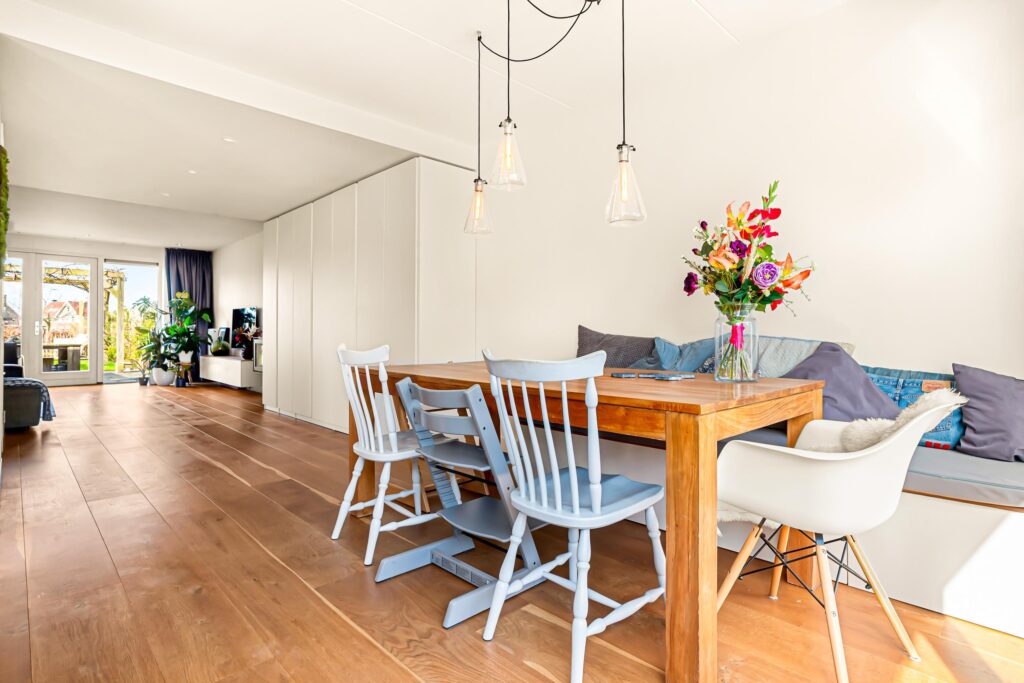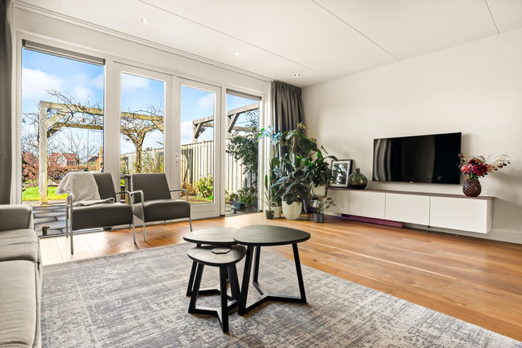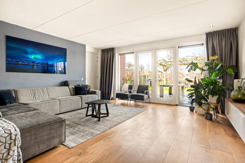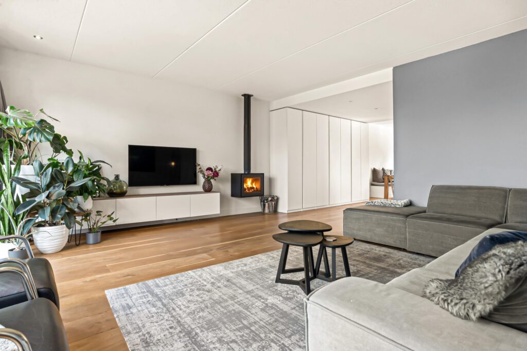De woonkamer verrast direct met zijn royale afmetingen, mede dankzij de uitbouw over de volledige breedte. Grote raampartijen zorgen voor een prachtige lichtinval en een adembenemend vrij uitzicht over de fraai aangelegde achtertuin en de daarachter gelegen plas. In de wintermaanden vormt de open haard het warme middelpunt van de ruimte, terwijl u in de zomer via de openslaande deuren zo de tuin inloopt.